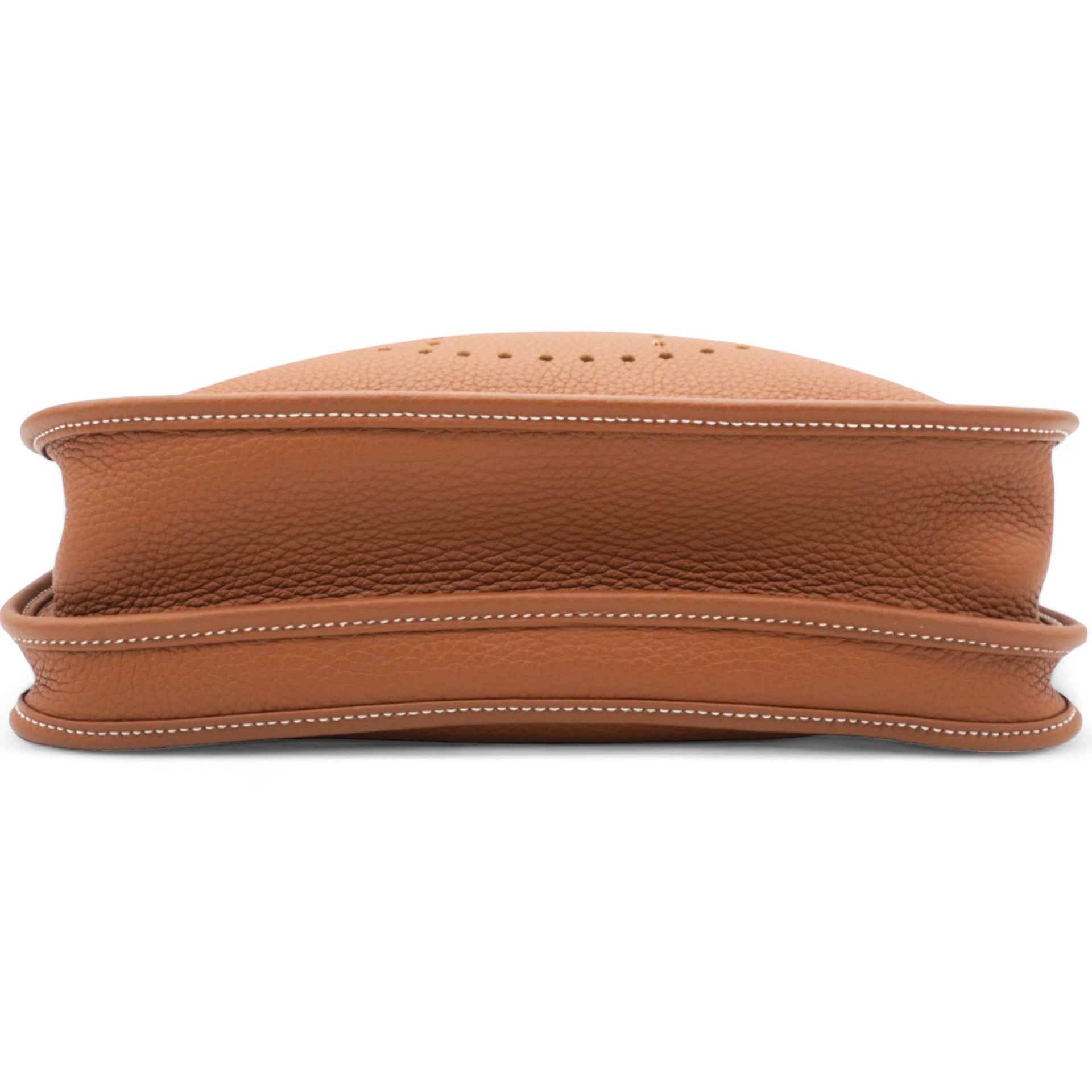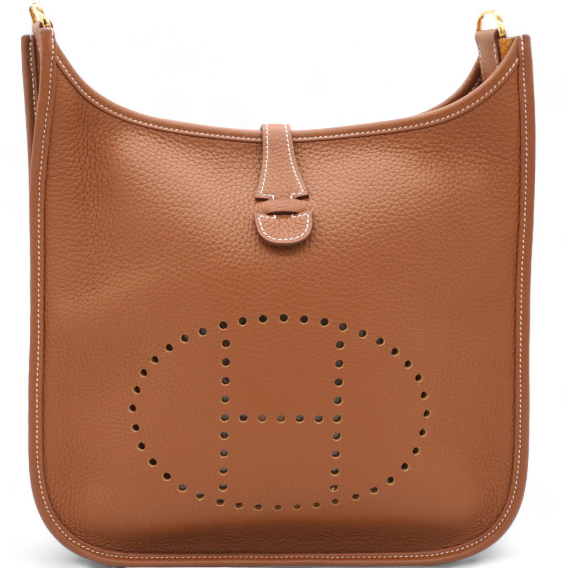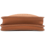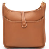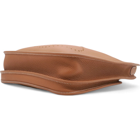 | This stylish messenger bag is crafted of fine Taurillon Clemence calfskin leather in brown. It features an adjustable matching canvas shoulder strap, a rear pocket, and a perforated Hermes H oval on the front of the bag. The top of the bag opens with a cross over strap to a matching suede interior. |