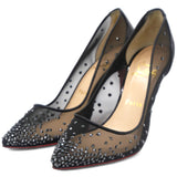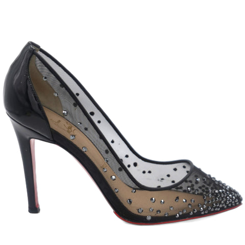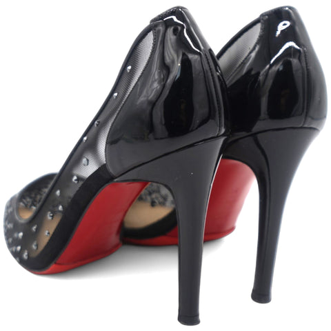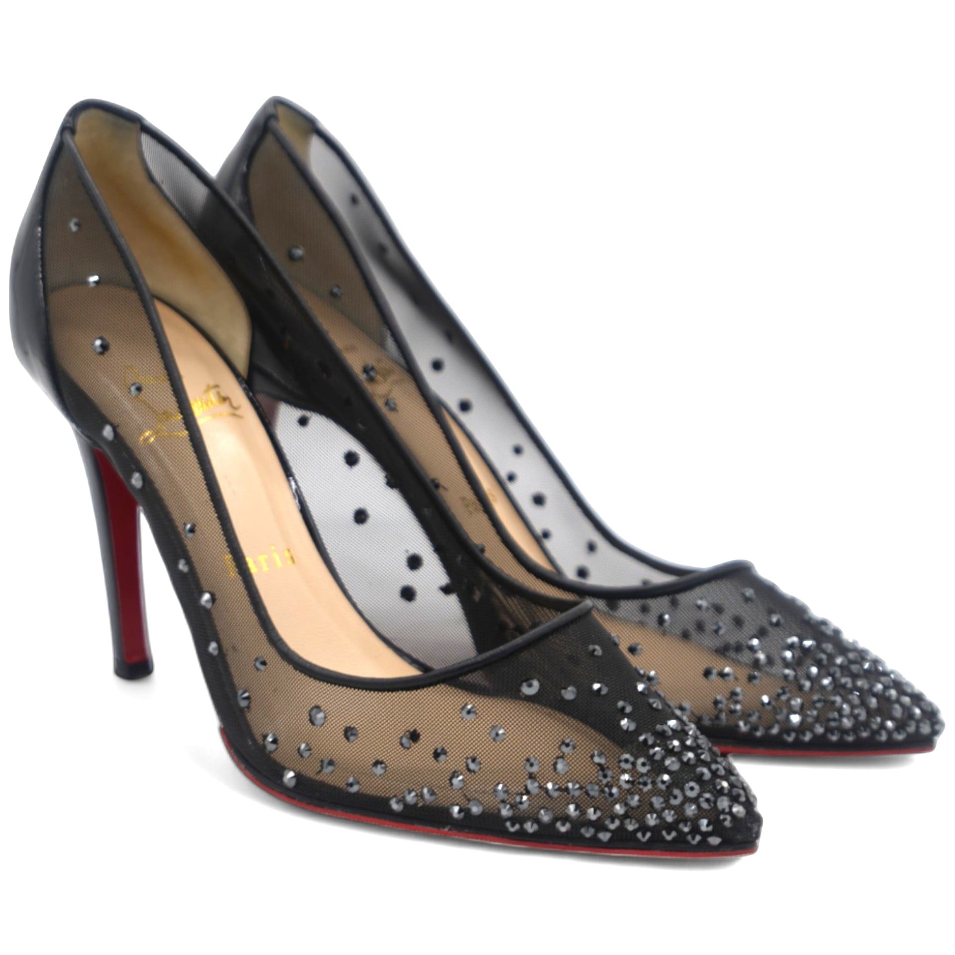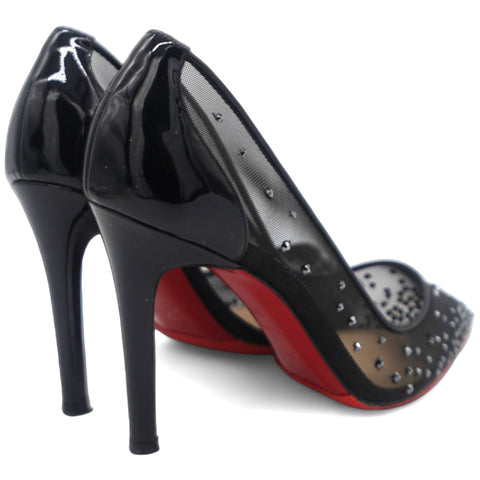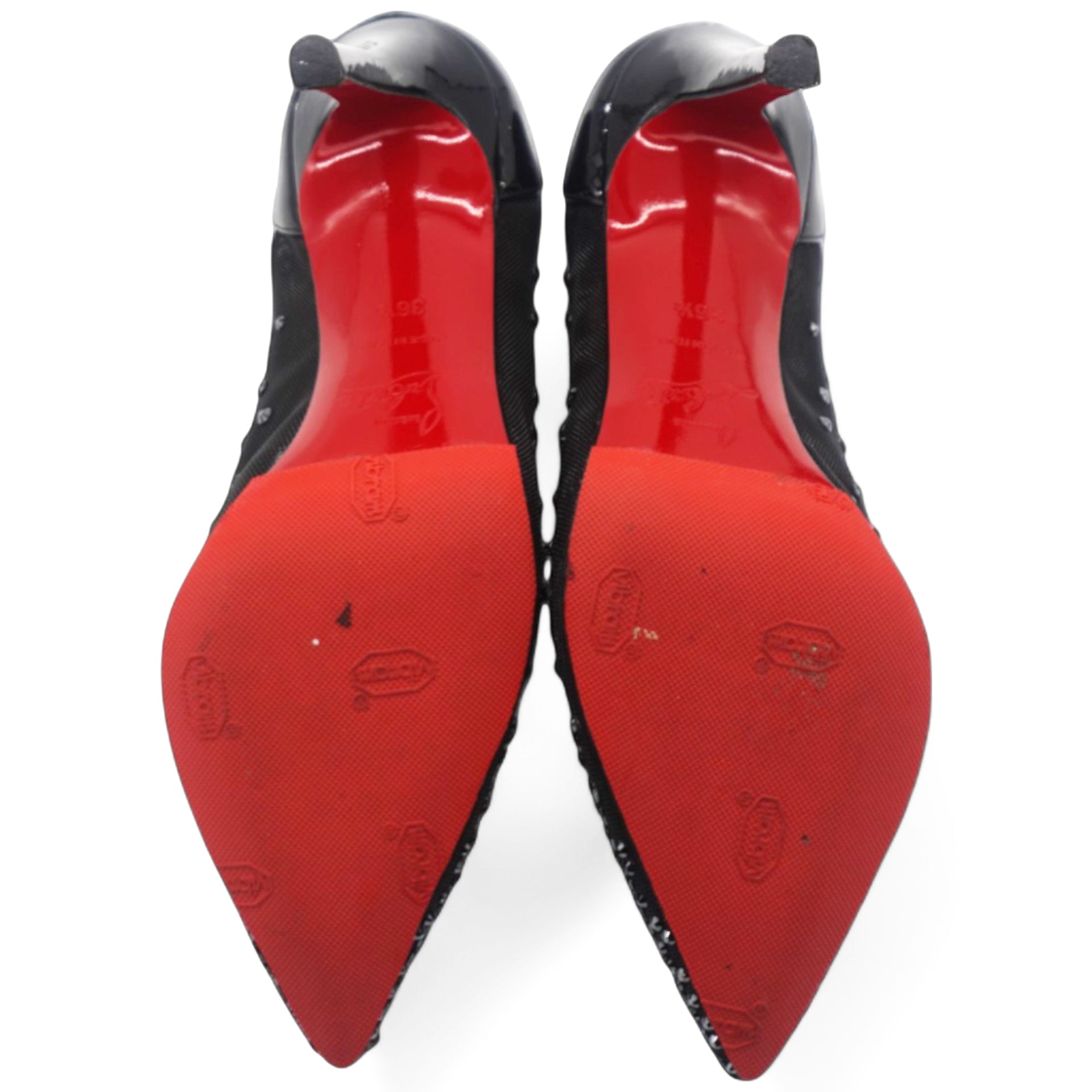 | These classic pumps feature black suede heels and uppers of black mesh with crystals and a pointed toe box. They feature a 4-inch stiletto heel and iconic red-lacquered soles. |