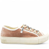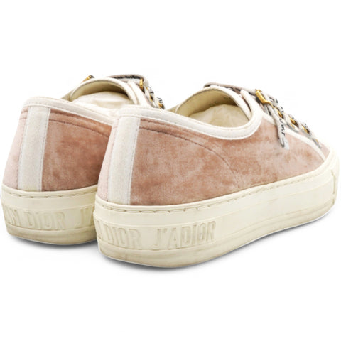 | These stylish sneakers are crafted of velvet in light pink with white rubber soles and white Christian Dior logo laces. |