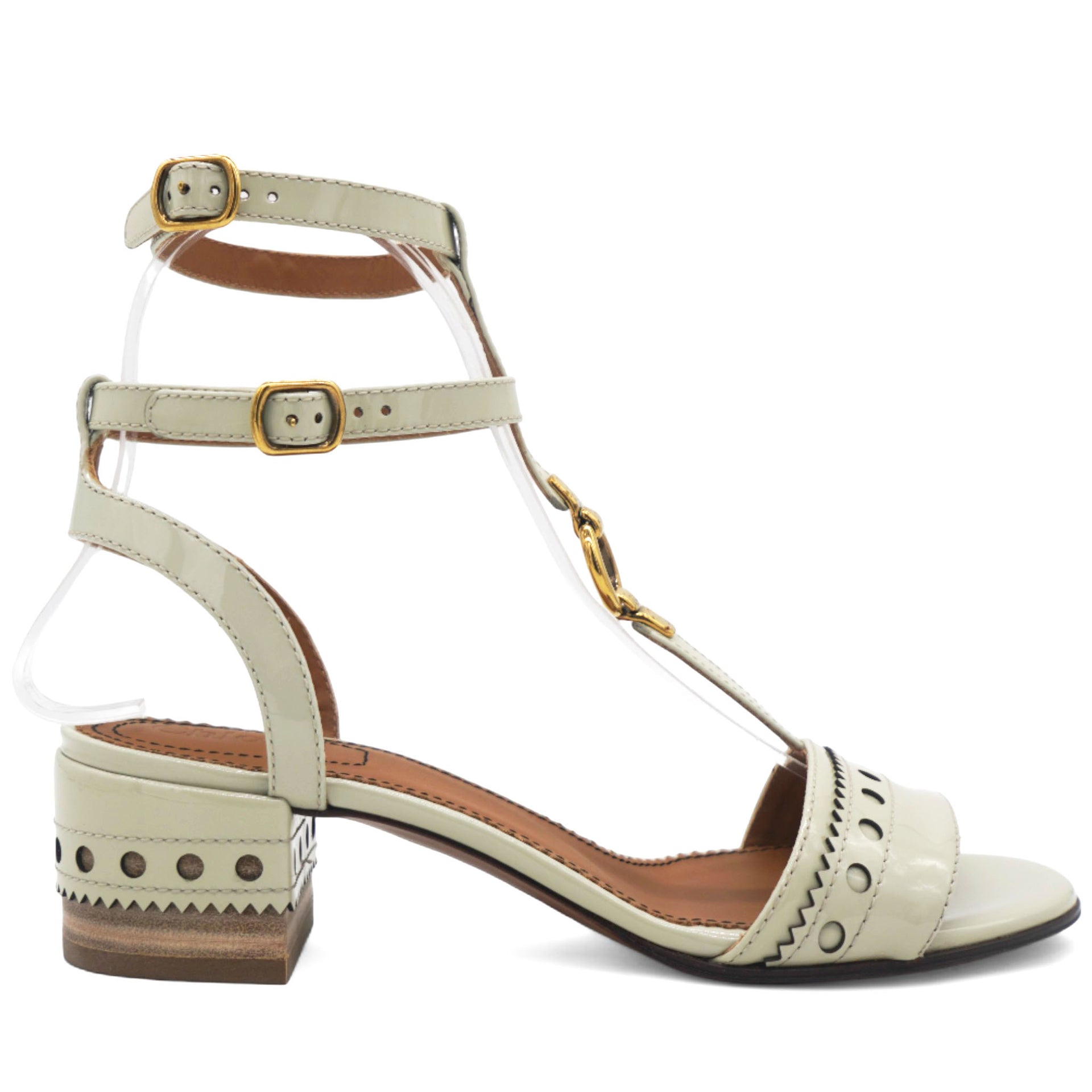 | Chloe understands your need for comfort and style in these sandals. They are crafted from patent leather and designed with a T-strap at the front, buckle closure at the ankle and short block heels. These sandals speak elegance and poise. |