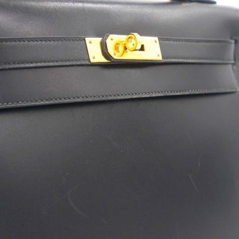 | This tote is crafted of beautifully smooth box calfskin leather in black. The handbag features a reinforced leather top handle with polished gold plated links, a cross over flap and strap closure with a signature Kelly gold plated turn lock, a padlock and keys. These open to a matching chevre goatskin leather interior with zipper and patch pockets. |