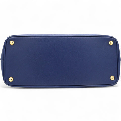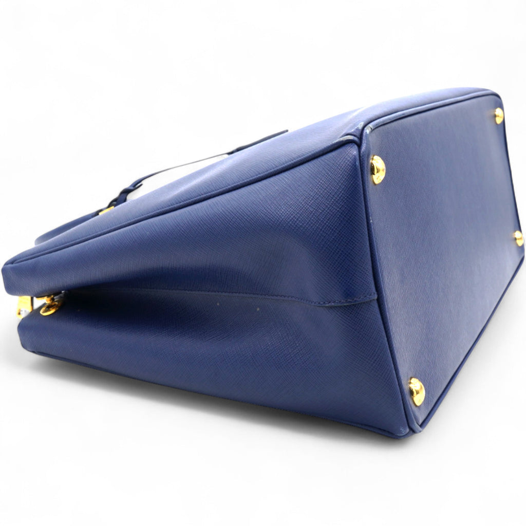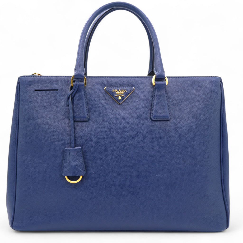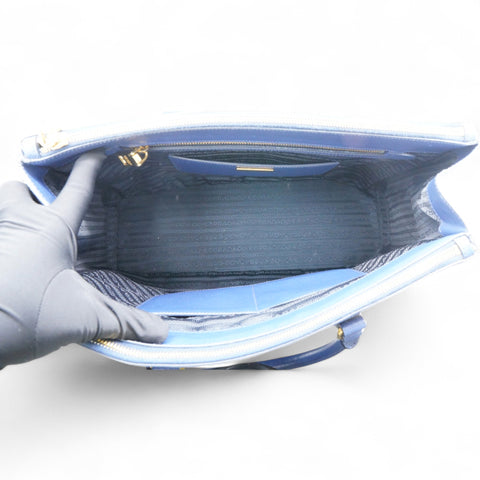 | This tote bag is crafted of cross-grain leather in blue. The tote features rolled leather top handles and gold hardware. It includes two zipper compartments and a main compartment with a blue Prada logo jacquard interior with zipper and patch pockets. |
