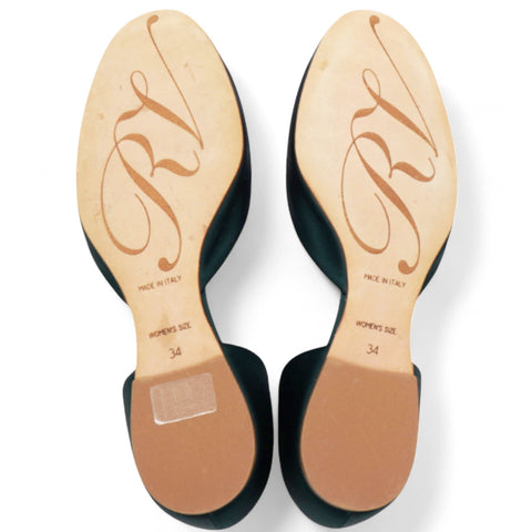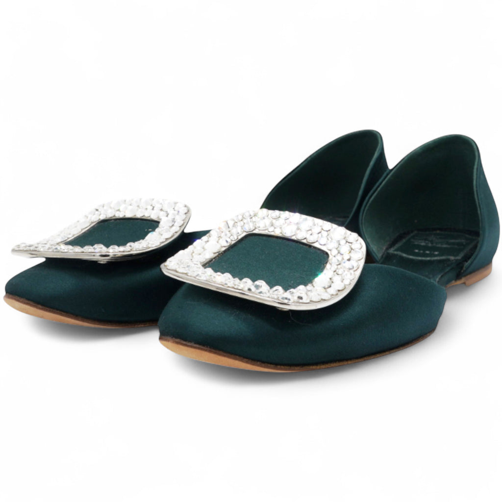 | Roger Vivier Chips Crystal Strass Buckle D'Orsay Flats in Green Satin For a timeless look in green, these delicate d'Orsay flats are perfect. Made with an elegant satin upper, they feature the iconic metal curved buckle with crystals, making them ideal for dressy occasions. |