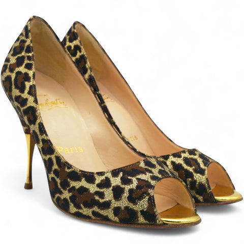 | These stylish pumps have a wrapped stiletto and are crafted of shiny leopard print with a chic peep toe. These are wonderful shoes with a one of a kind look from Christian Louboutin! |