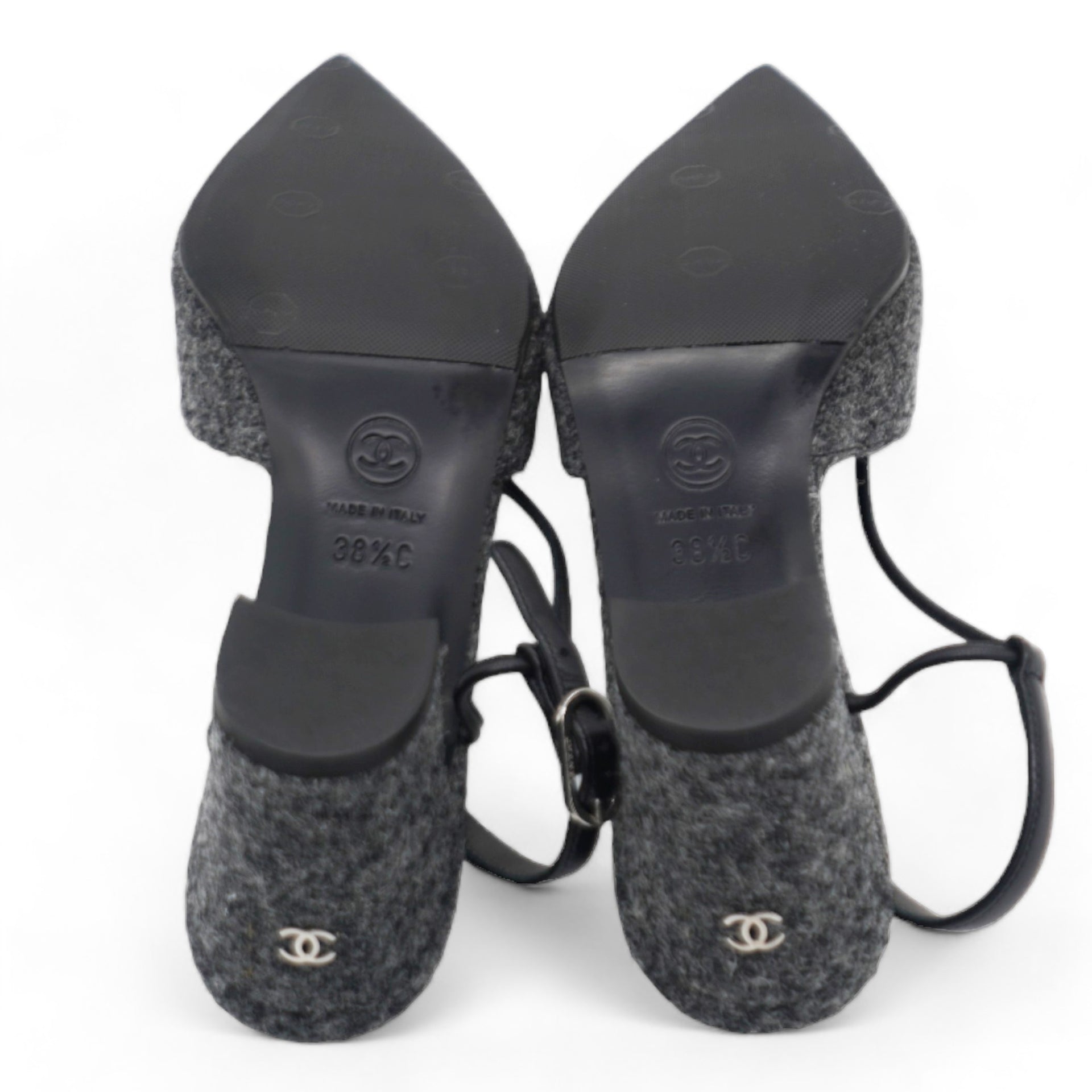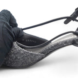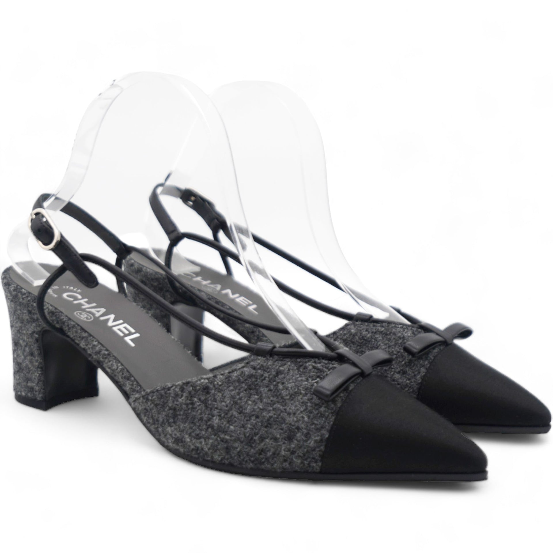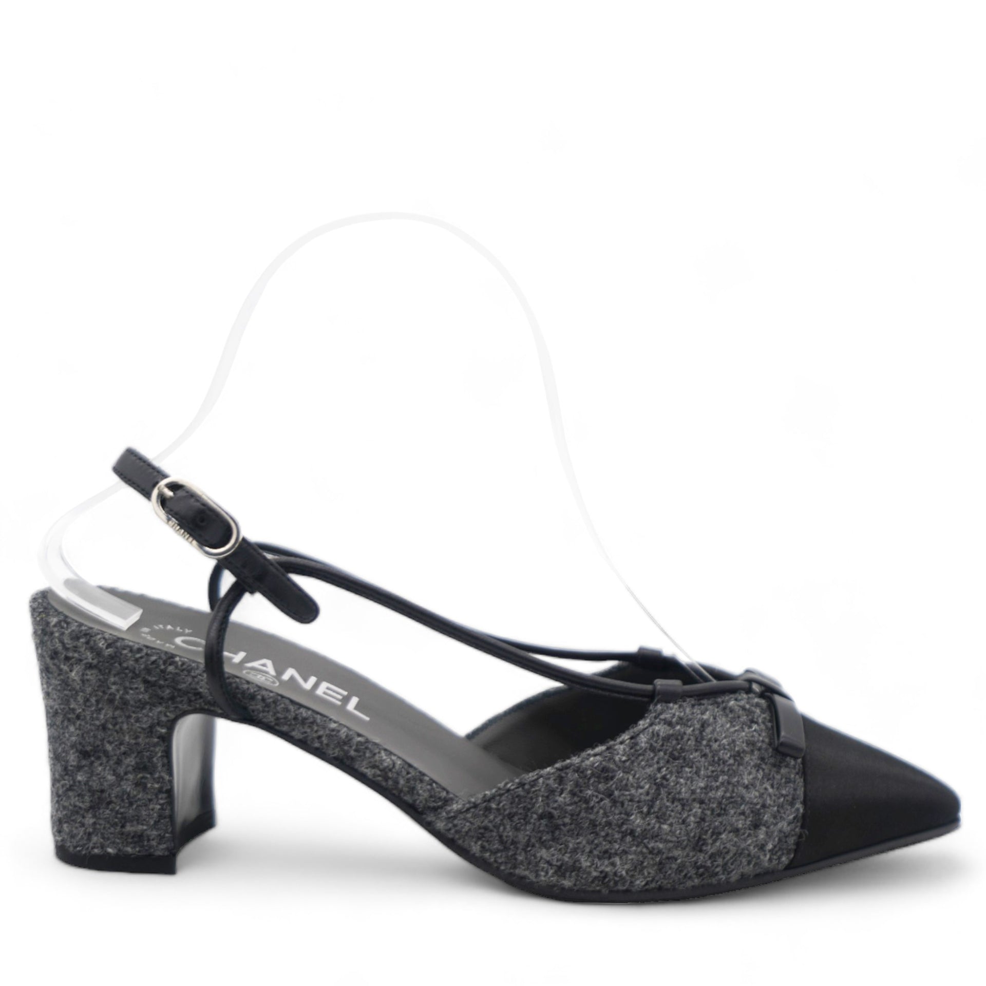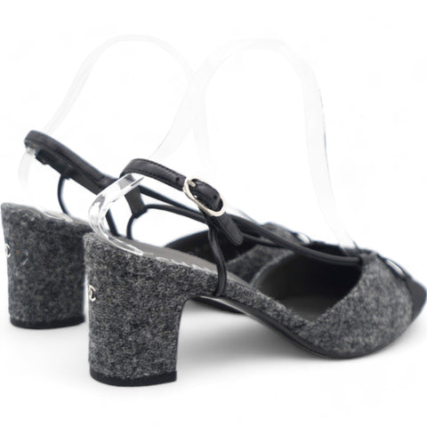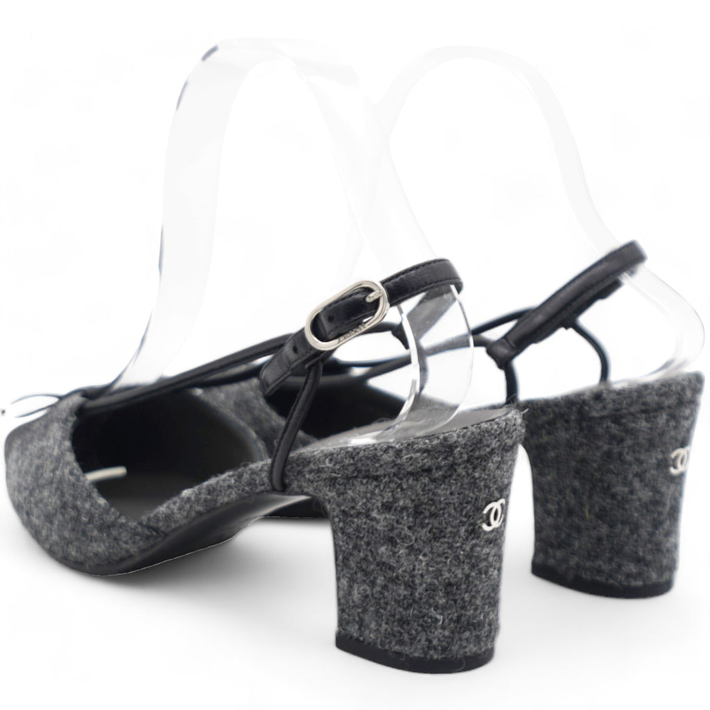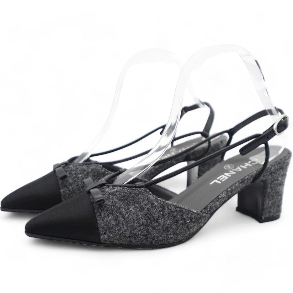 | These chic slingback pumps are crafted of grey tweed, with a pointed black satin cap toe. The shoes feature a small polished silver Chanel logo at the 2.5-inch tweed-wrapped heel, and adjustable black leather ankle straps. These are timeless pumps, only from Chanel!. |
