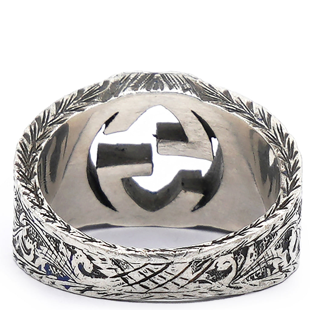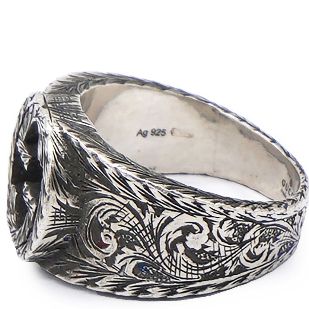 | The ring is crafted of antiqued finish sterling silver and features Gucci's signature GG logo atop a spiral motif band. |