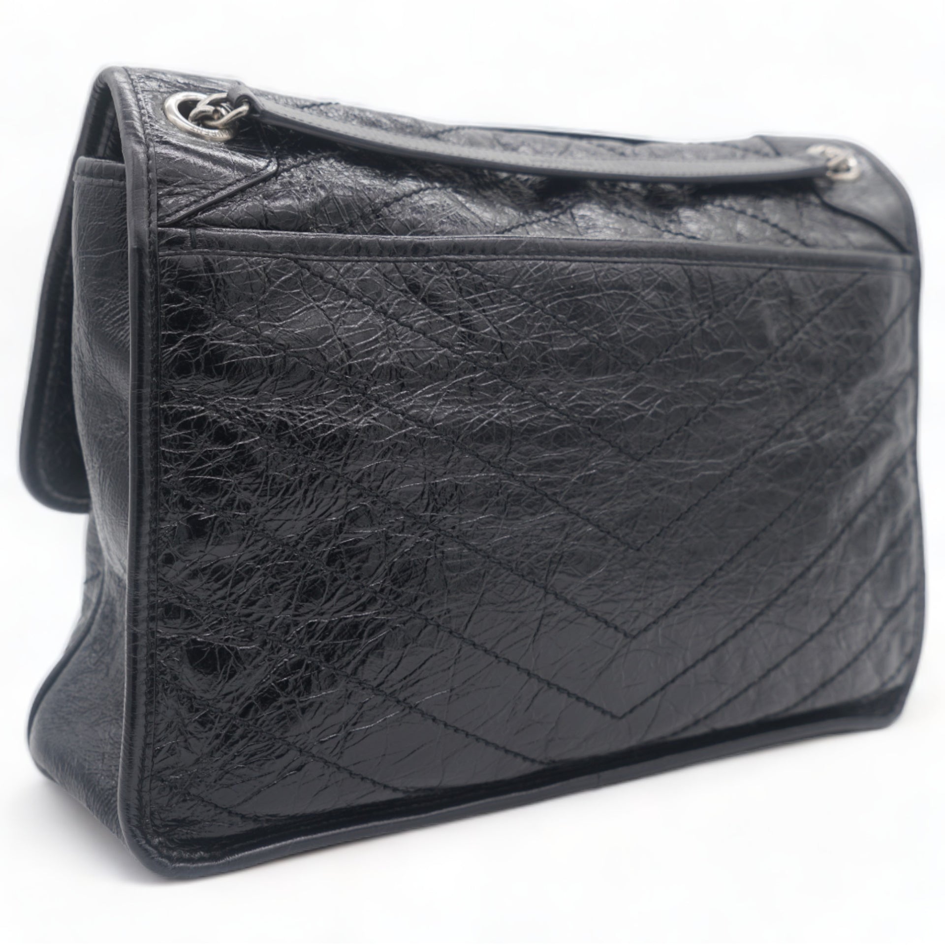 | Carry this bag from Saint Laurent without compromising on style. This aged leather bag comes in a relaxed style with shoulder handles and YSL-detailed flap closure. The Niki bag is equipped with a canvas-lined interior sized to hold your necessities with ease. |
