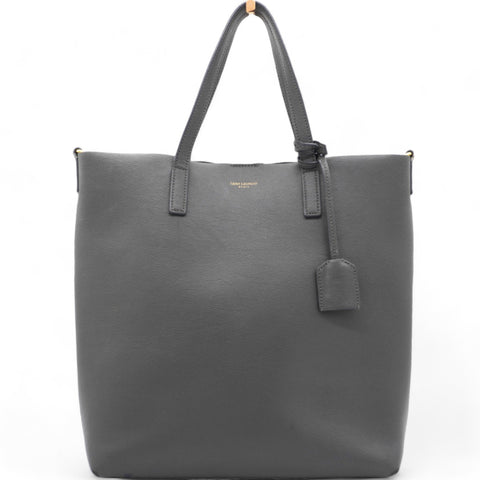 | This stylish tote is crafted of luxurious calfskin leather in grey. The bag features leather top handles and an optional, adjustable shoulder strap with gold hardware. The top is open to a spacious grey suede leather interior. |