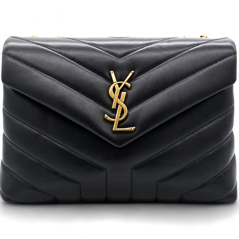 | This elegant shoulder bag is crafted of chevron quilted calfskin leather. The bag features an aged gold chain link shoulder strap with shoulder pads, and a gold YSL detail on the crossover flap. The bag opens to a partitioned black fabric interior with zipper and patch pockets. |