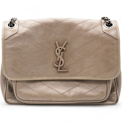 | This elegant shoulder bag is crafted of chevron-quilted leather in beige. The bag features a ruthenium chain-link shoulder strap with matching leather shoulder pads. The front flap has a prominent YSL monogram detail and opens to reveal a front pocket and a black fabric interior with a patched pocket. |