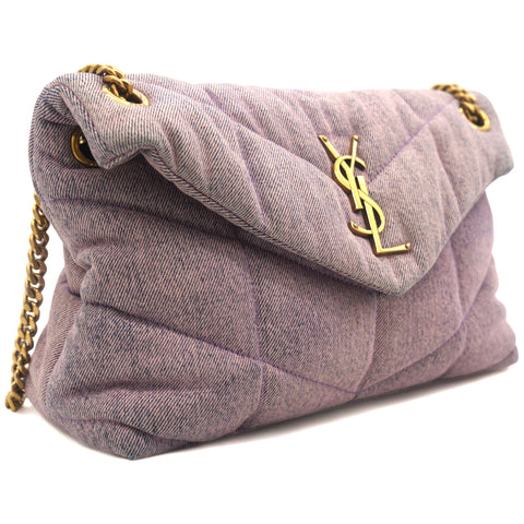 | This elegant shoulder tote features chic quilted light purple denim. The bag has aged gold chain-link shoulder straps with light purple leather shoulder pads. The front flap features a prominent YSL monogram detail and opens to a black fabric interior with a zipper pocket. |