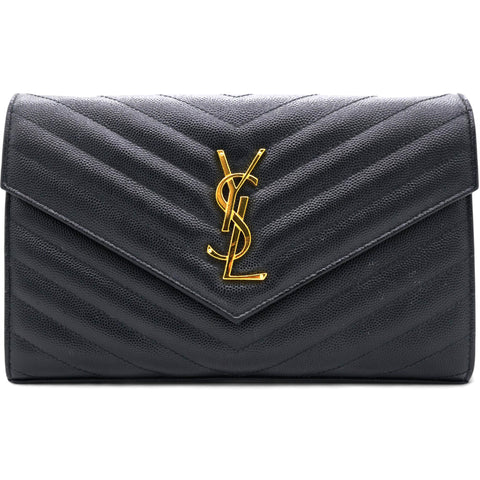 This wallet on a chain is crafted of finely pebbled chevron-quilted leather in black. It features a removable waist-length gold chain shoulder strap with a shoulder pad and a gold classic YSL emblem on the flap. This opens to a black fabric interior with card slots and a zipper compartment. .