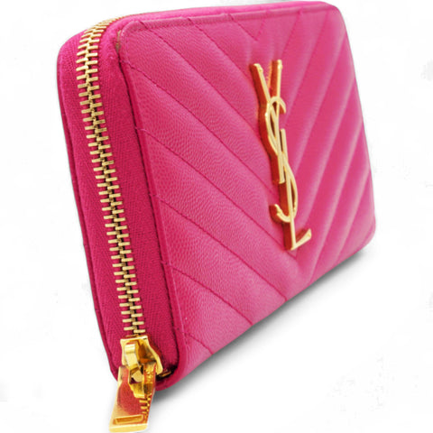| This chic wallet is crafted of calfskin leather in hot pink.The 3/4 wrap around polished gold zipper opens to a partitioned interior with a zipper pocket, bill compartments and two card slot panels. |