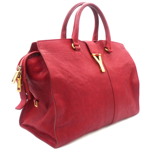 | This elegant red Cabas Chyc tote from Saint Laurent is ideal for everyday use. Crafted from leather, the bag is detailed with a gold-tone hardware Y motif snap closure and dual rolled handles. The top zip closure opens to a spacious interior that is perfectly sized to hold all your necessities. |