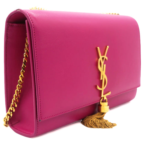 | This stunning small shoulder bag is crafted of smooth calfskin in fuschia. The bag features a polished gold chain link cross body shoulder strap and a facing flap with a polished silver YSL logo and a gold knobbed miniature gold chain tassel. The flap opens to a fuschia suede interior with a patch pocket. |
