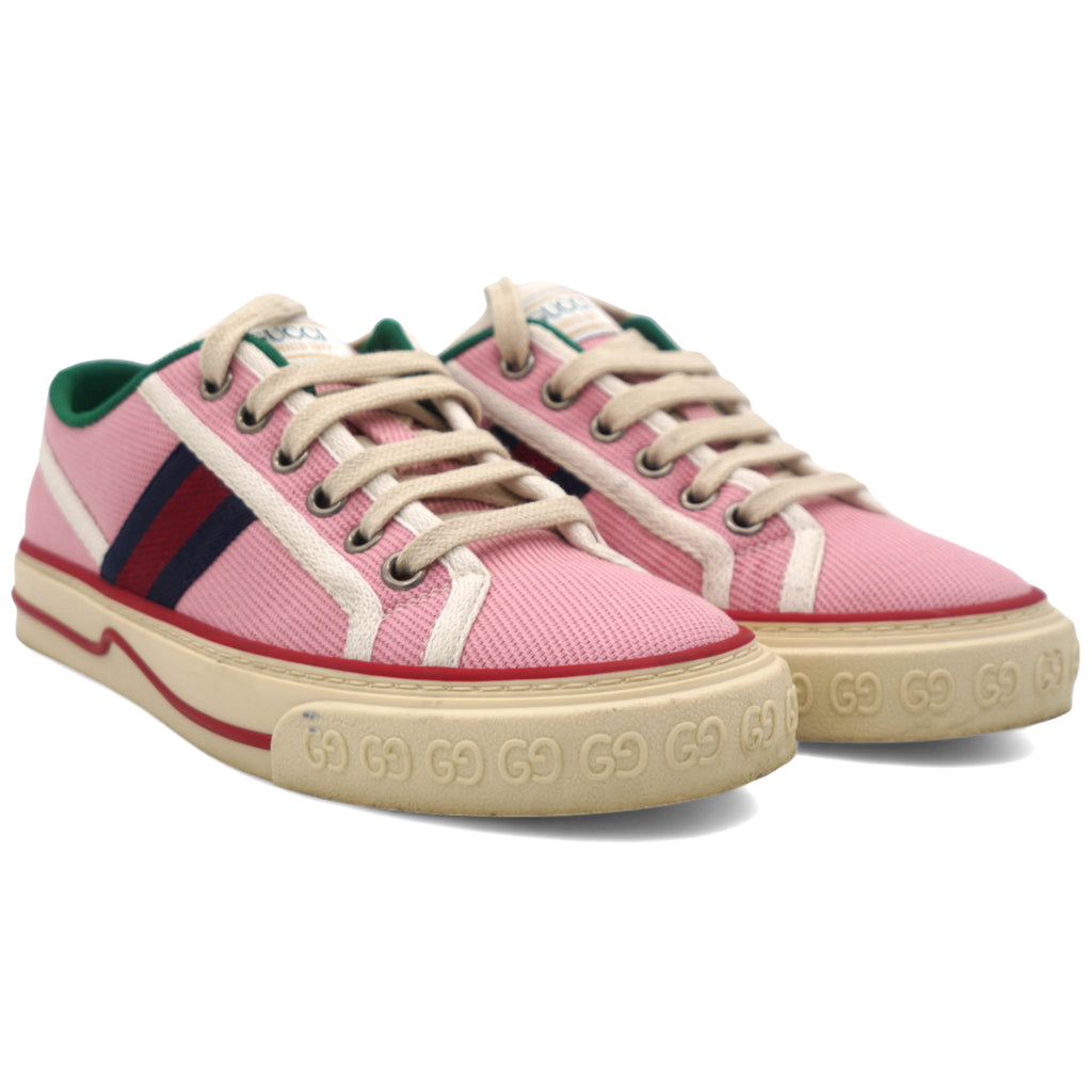 | This is an authentic pair of GUCCI Canvas Web Womens 1977 Tennis Sneakers in Wild Rose and Mystic White. These stylish sneakers are crafted of pink canvas with red trim, and red and navy blue stripes accented on the sides. |