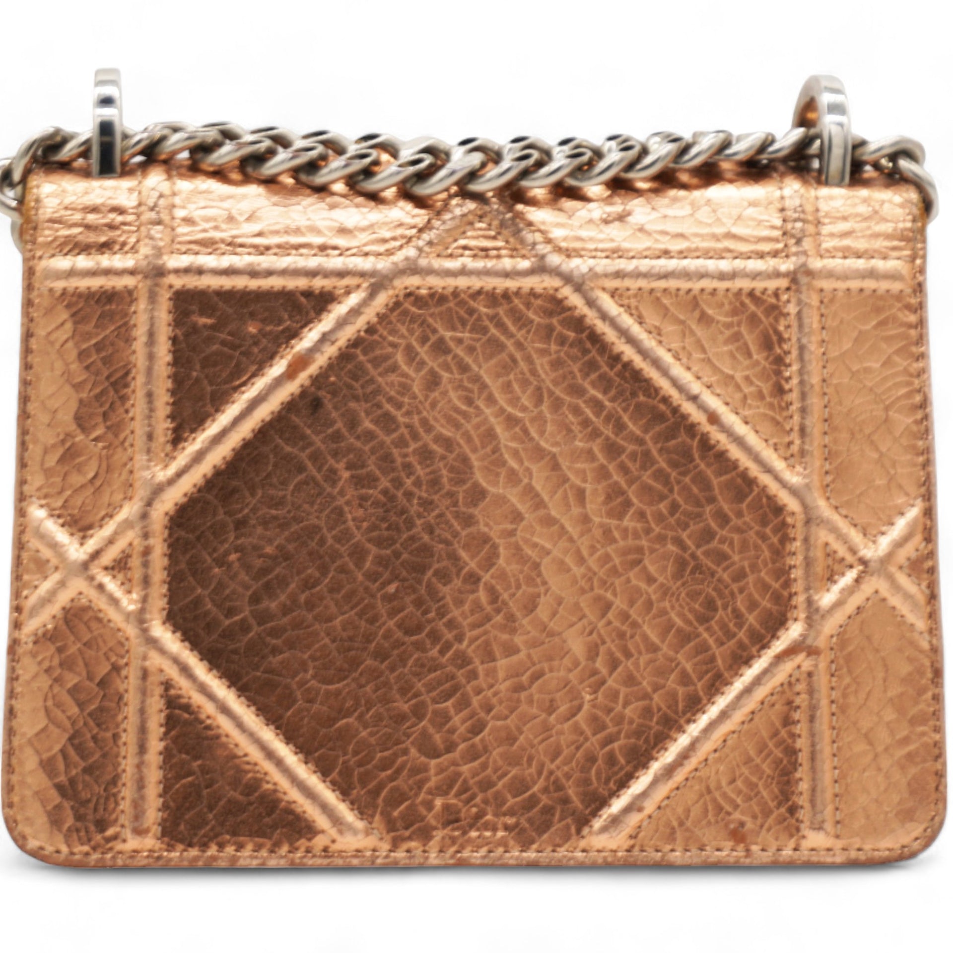 | This chic crossbody bag is crafted of ceramic effect deerskin leather in metallic light copper, with prominent geometric ribbing. The bag features a silver chain-link crossbody strap and a facing faux lock. This opens to a slate blue leather interior with zipper and patch pockets. This is an ideal shoulder bag for daytime or evening essentials from Christian Dior! |