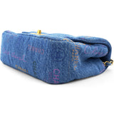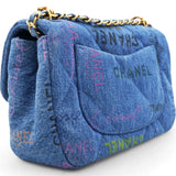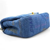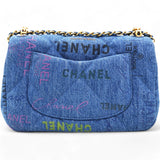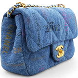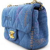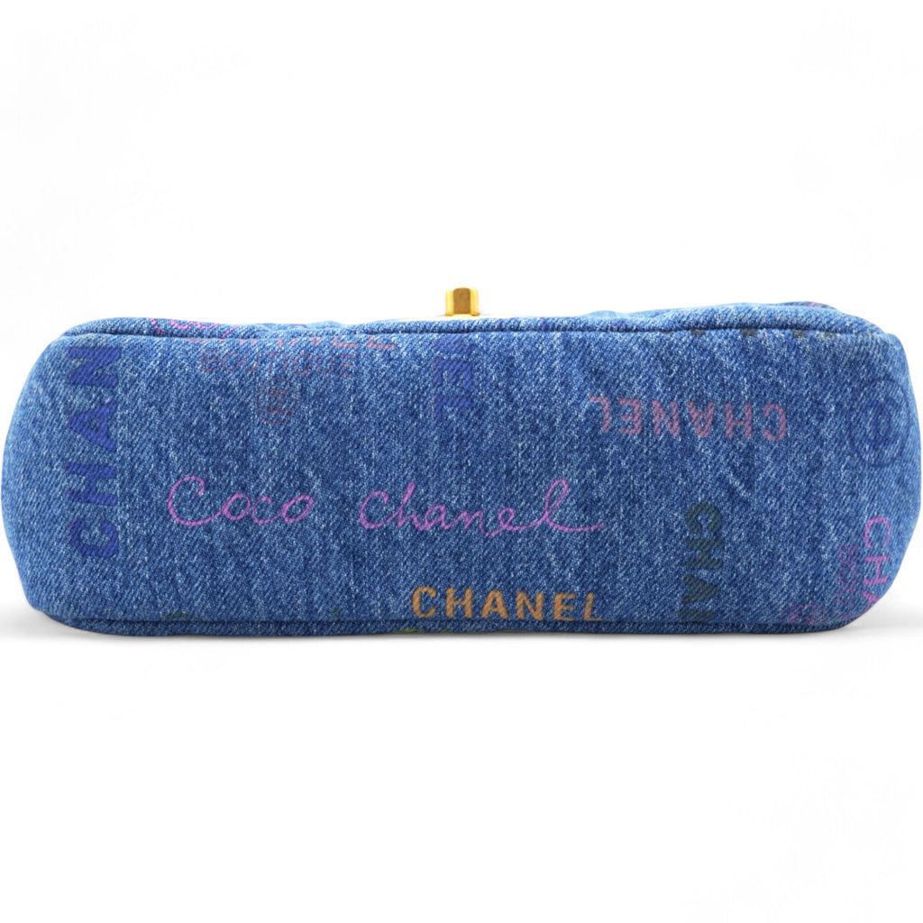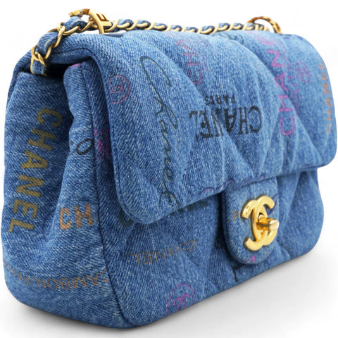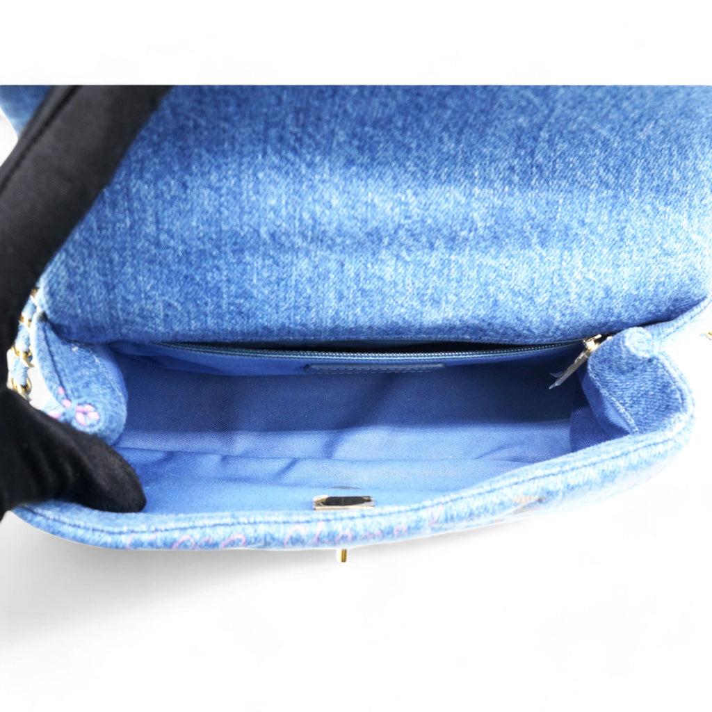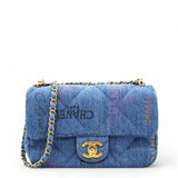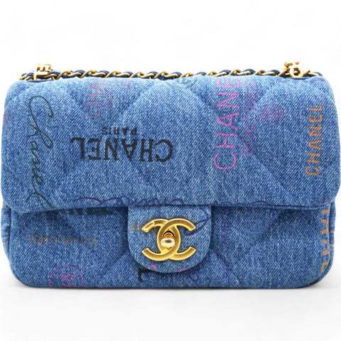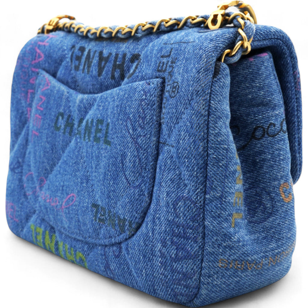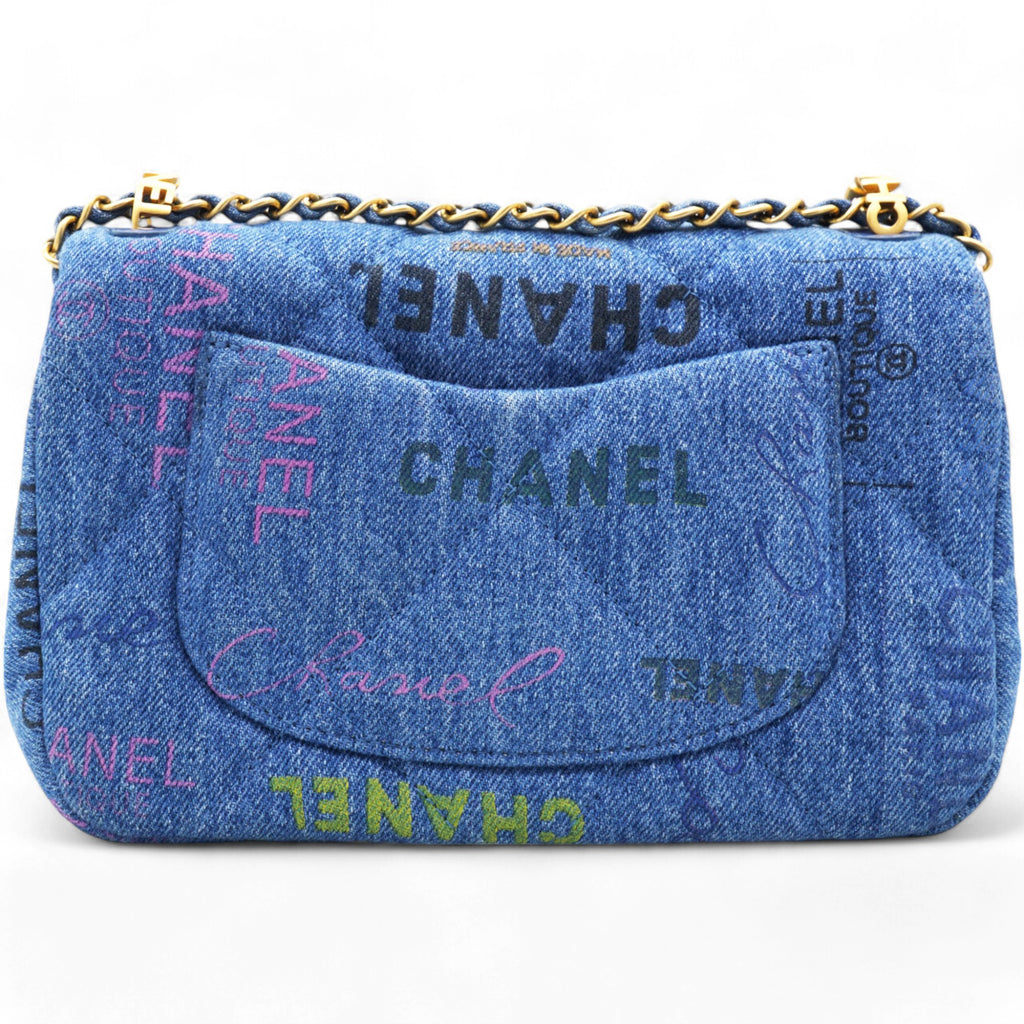 | The chic crossbody bag is crafted in soft quilted blue denim. The bag features a gold chain-link denim threaded shoulder strap, rear patch pocket, and a facing classic gold CC turn lock. This opens the flap to a matching denim interior with a zipper pocket. |