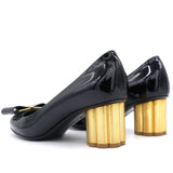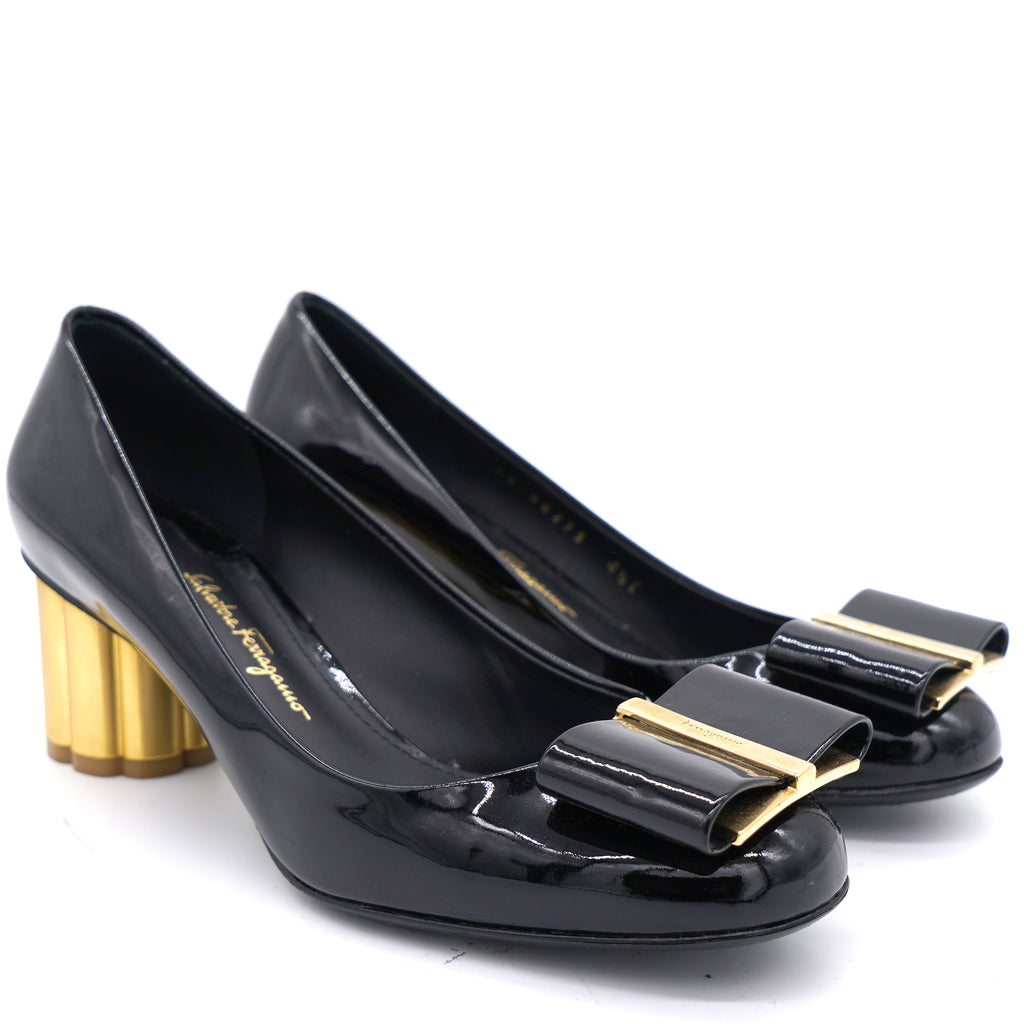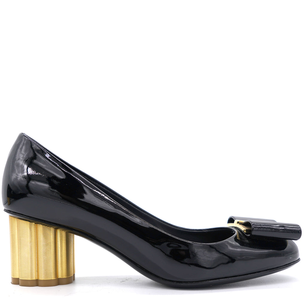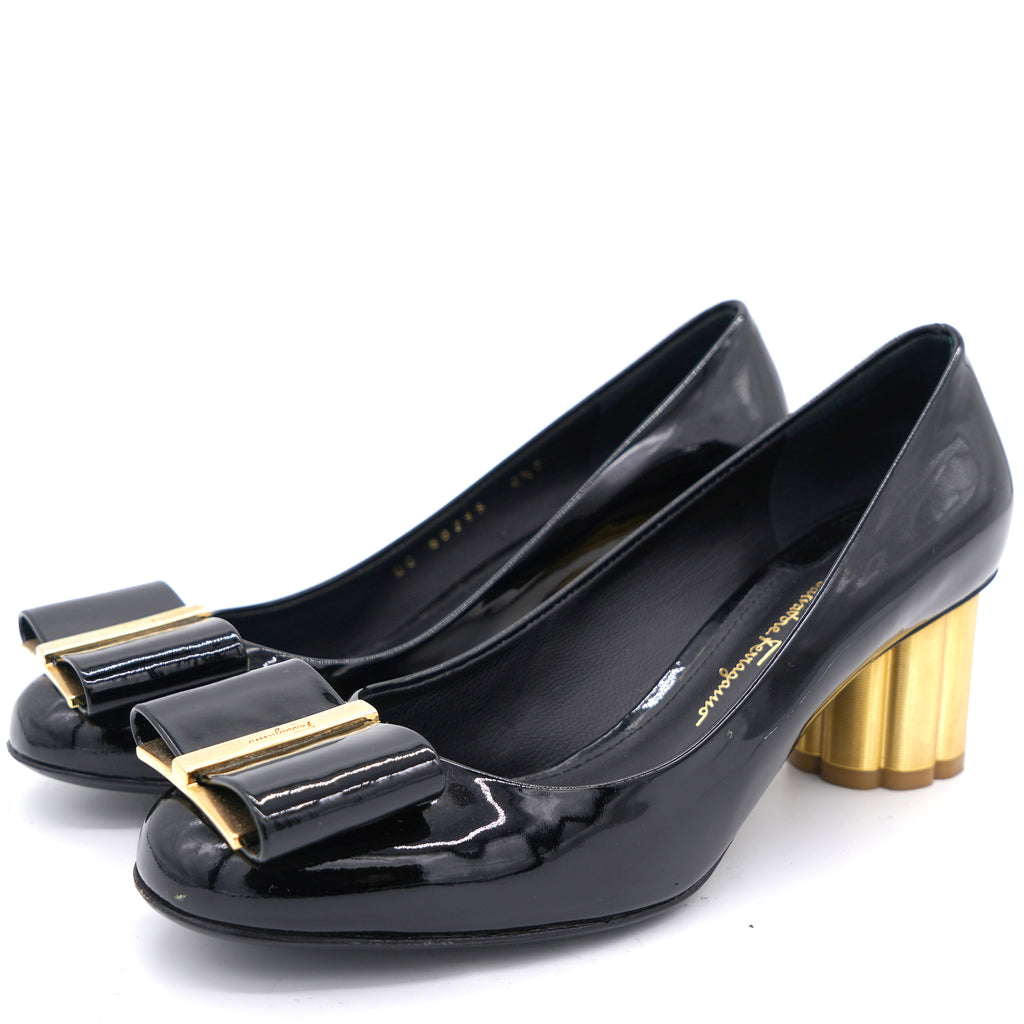Made from good quality leather, this pair of black pumps will add a classic touch to your collection of heels. Designed with the signature bow details on the uppers and elevated on 6 cm block sculpted heels, this black pair by Salvatore Ferragamo is the epitome of sophistication.