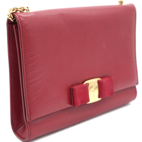 | There's nothing sweeter than the shy shade of Ferragamo's Vara Mini Bag. Crafted from thick, textured red leather with gold hardware, this bashful little bag has a small ribbon bow on the front and a long, detachable chain strap. The flap secures with a true snap and inside you'll find tonal leather and fabric lining with a slit pocket. |