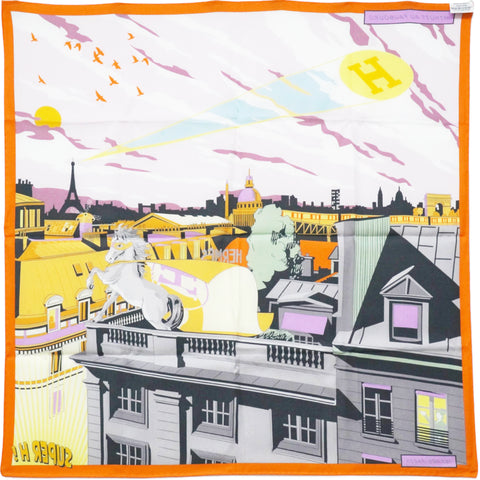 | This is an authentic HERMES Silk Minuit Au Faubourg Scarf size 70 in Orange, Gris and Jaune. This is a 100% silk scarf with a very elaborate design of a horse with a mask and cape on top of a building. |