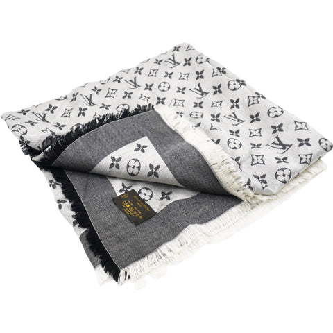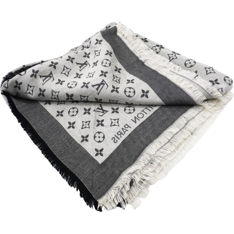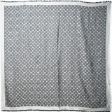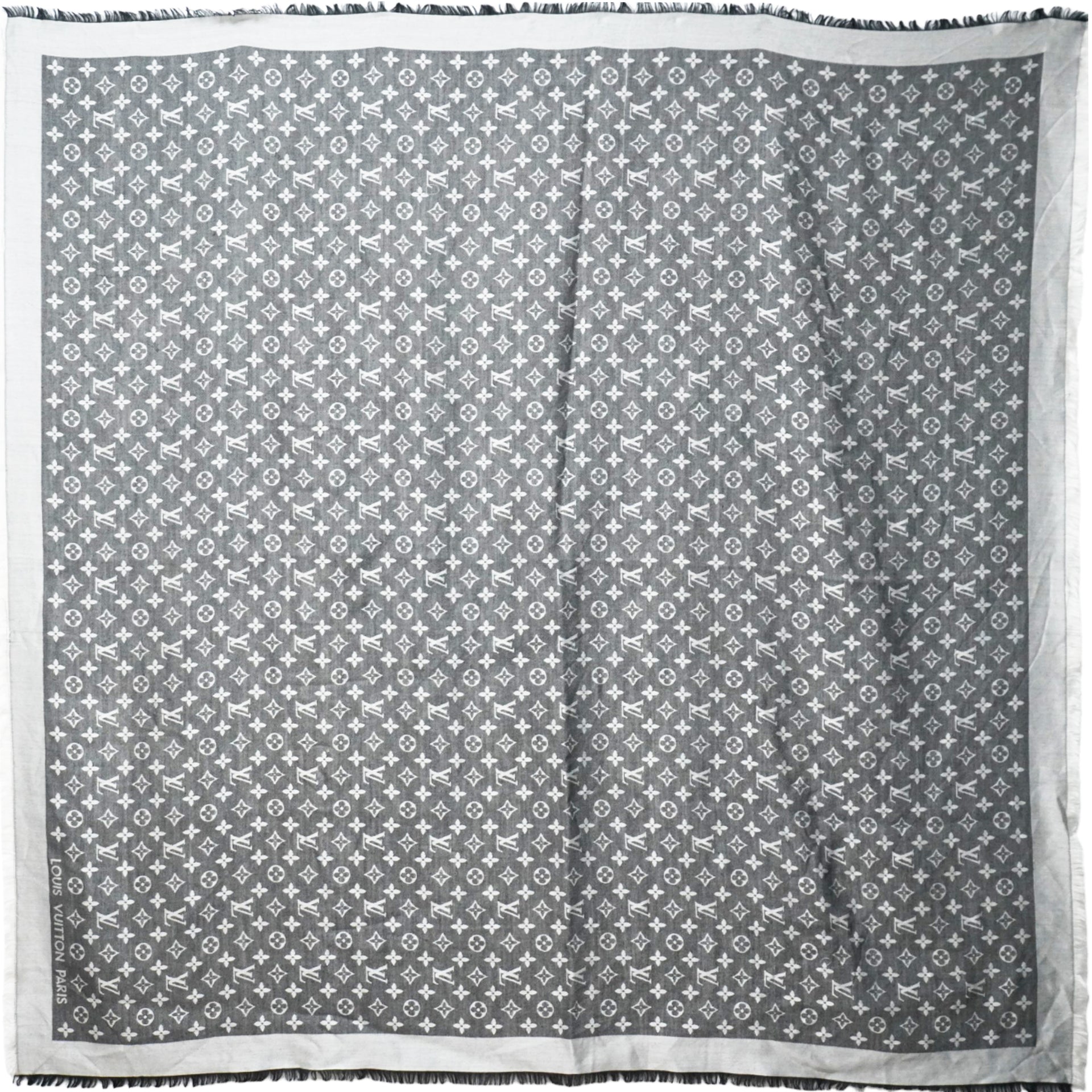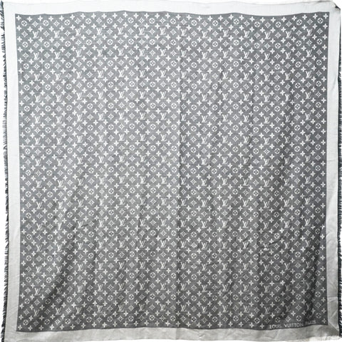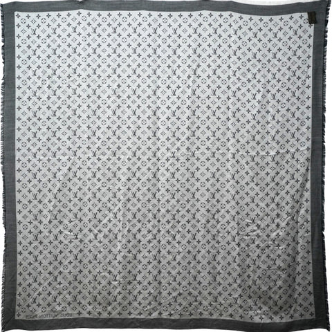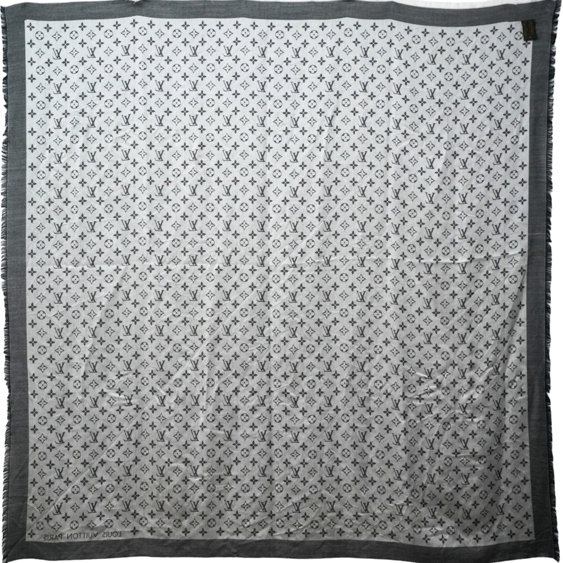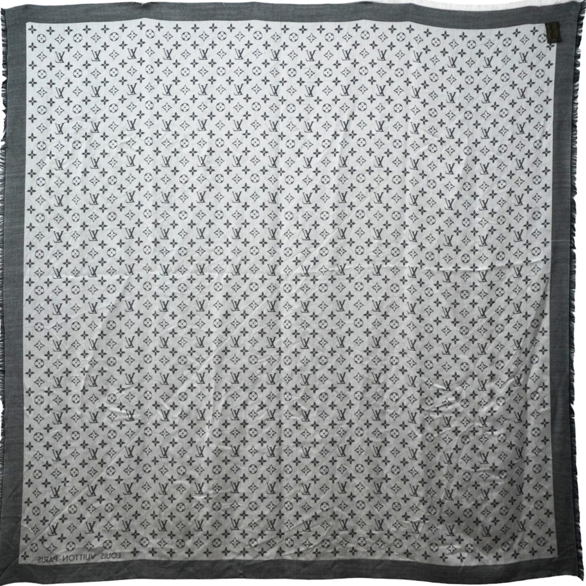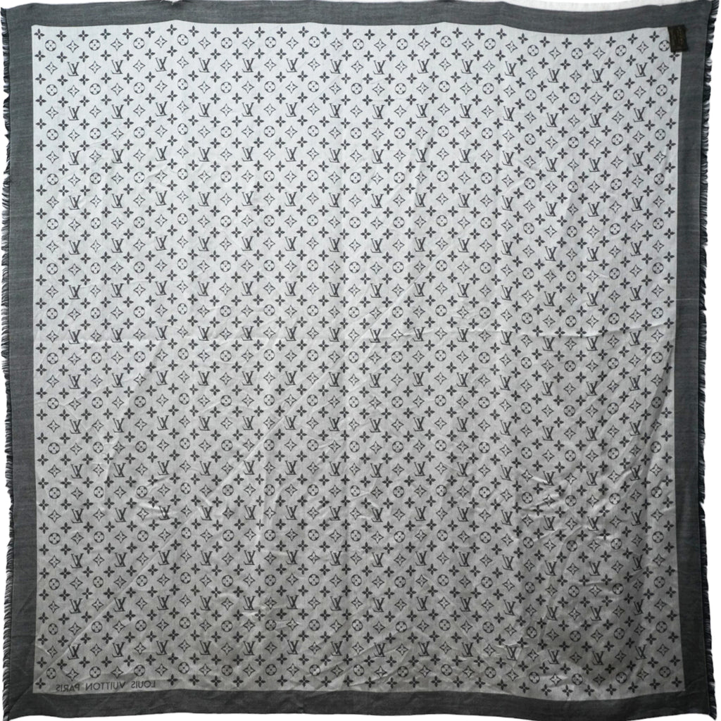 | The shawl is a 60% silk and 40% wool jacquard weave of the Louis Vuitton monogram. It is a large square with a fringed edge and can be tied around the body in any number of ways for very stylish looks. This shawl is an excellent accent to any wardrobe for the right accent of luxury and style from Louis Vuitton. |