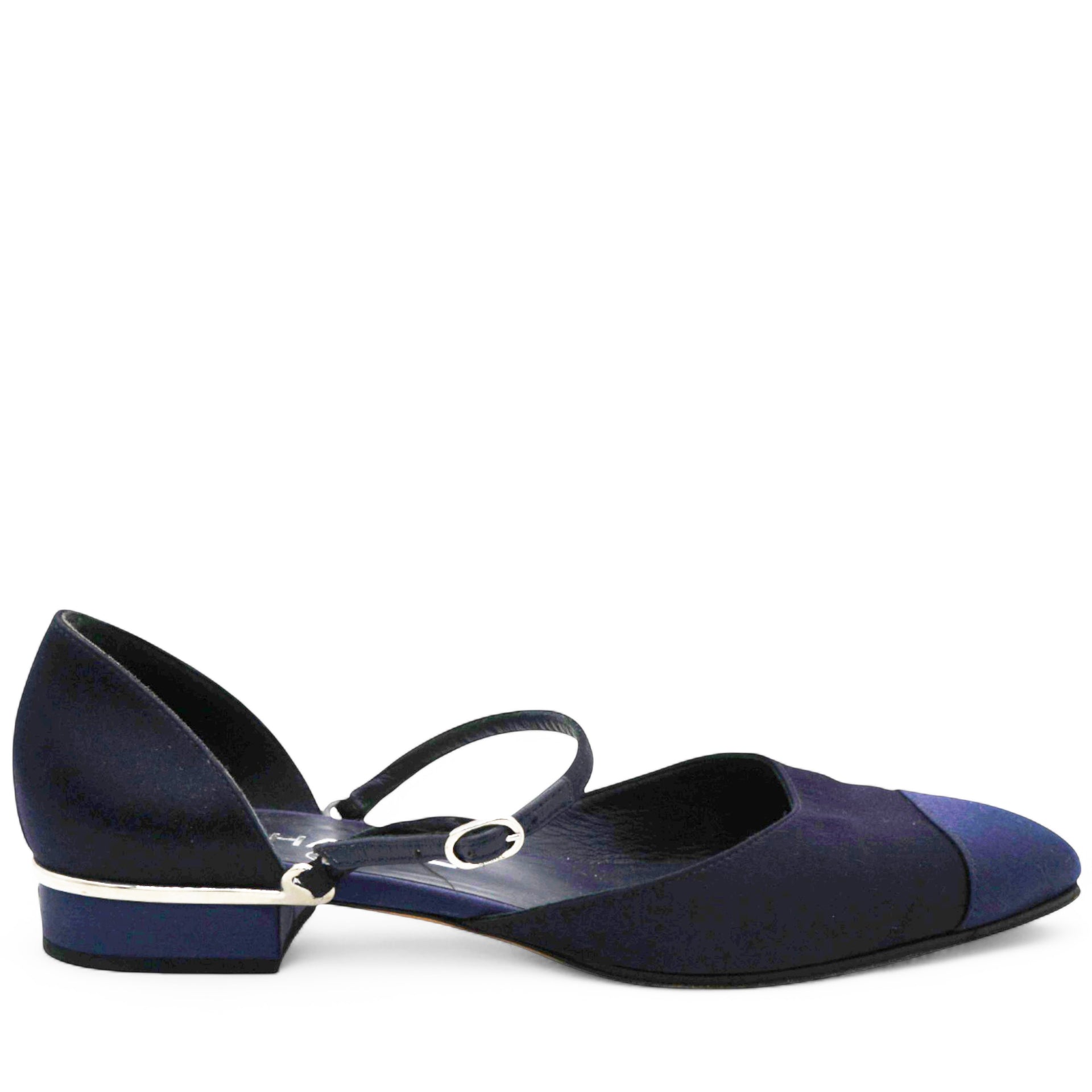| These Chanel flats are crafted in black and midnight blue satin canvas, offering a sleek and elegant contrast. Designed with a classic silhouette, they feature a rounded toe and subtle detailing that reflects the brand’s timeless style. Perfect for both casual and refined looks. |