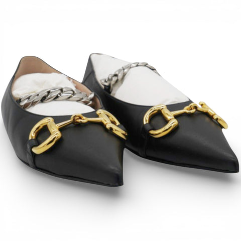 Black Leather Deva Horesebit Chain Link Ballet Flats Size38