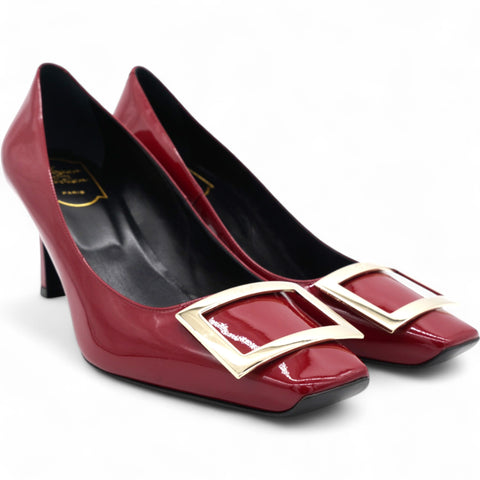 | Crafted with patent leather, these stunning pumps are versatile and a wardrobe classic. The burgundy hue on this Roger Vivier pair will amp up your style quotient almost instantly. Durable and gorgeous, they have a sleek shape, square-toes, and gold-tone hardware. |