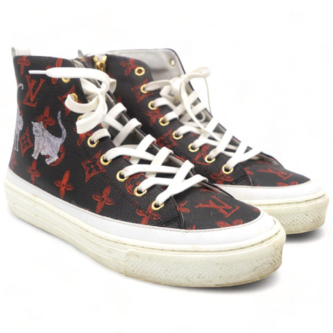 These luxurious high-top sneakers are crafted of monogram coated canvas with an overlaid print of cats. The sneakers feature white rubber soles, white shoelaces, and a gold zipper at the shaft.