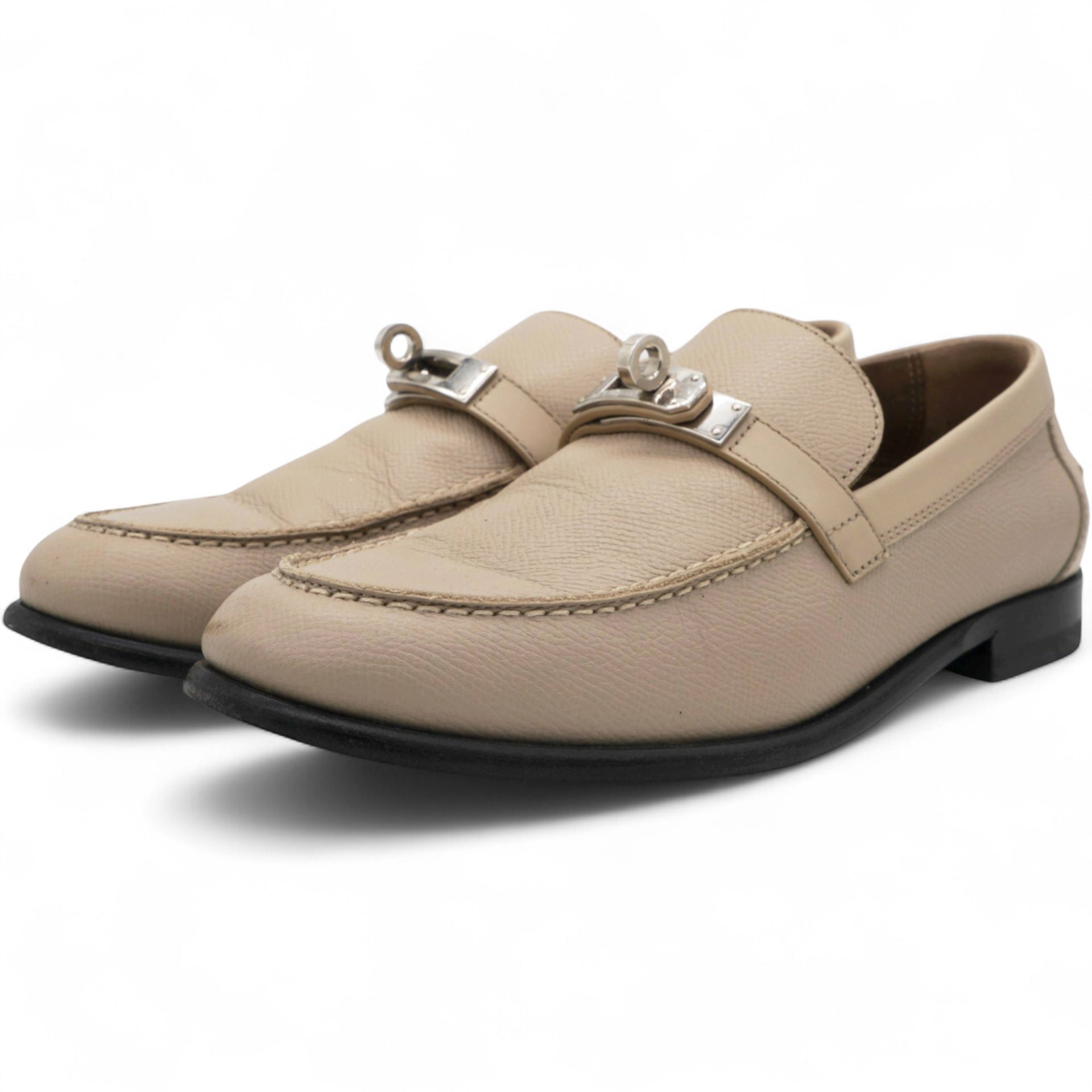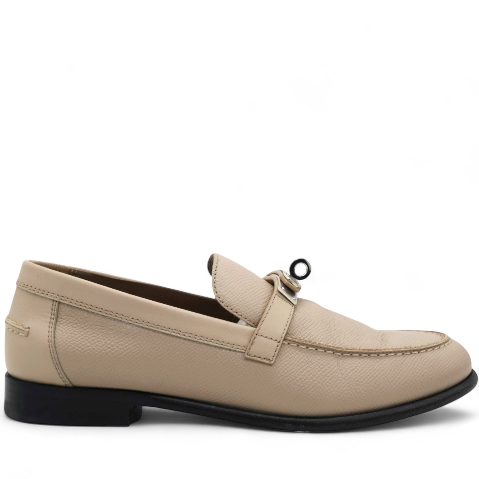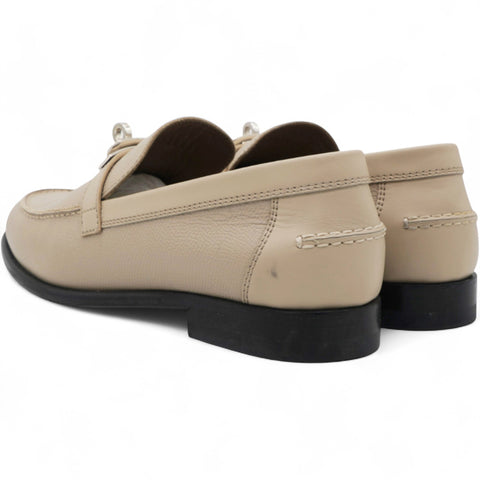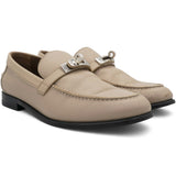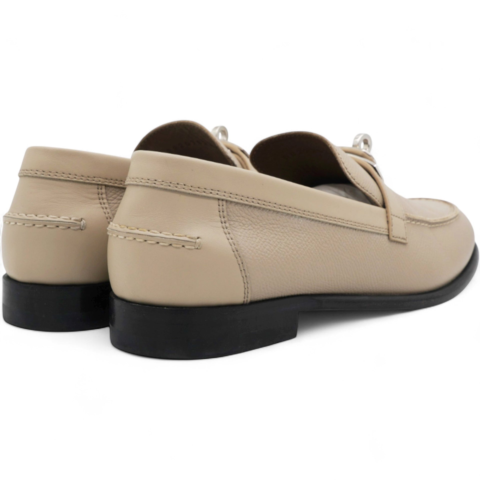 | These stylish loafers are crafted of grained taupe leather with palladium hardware and a 0.75-inch heel. |