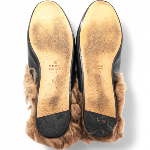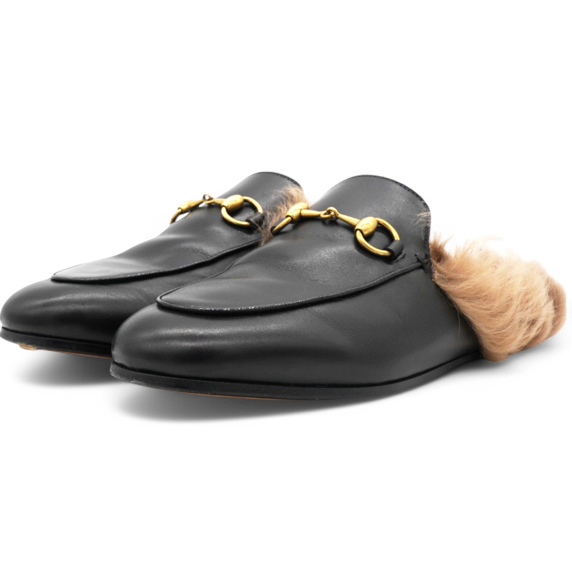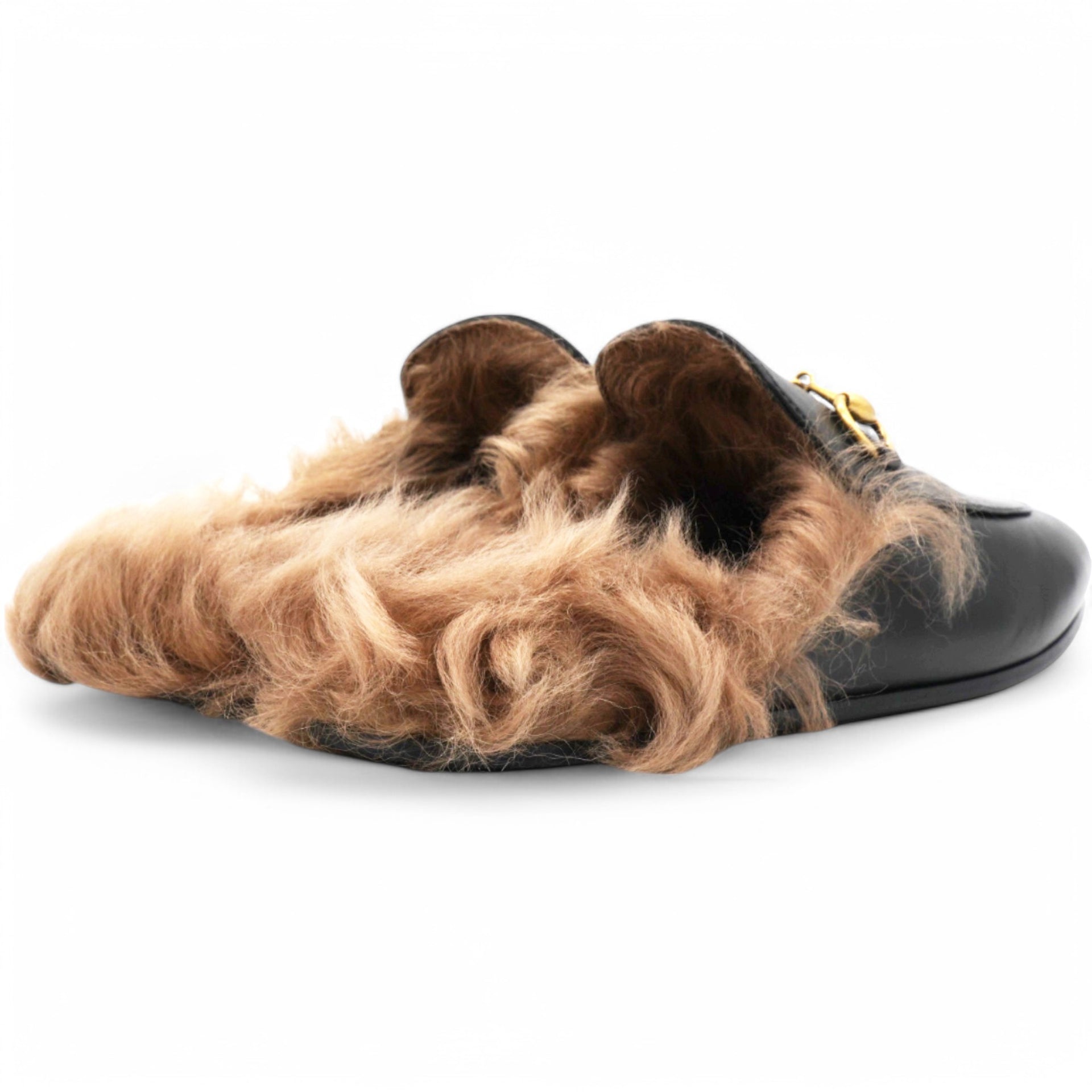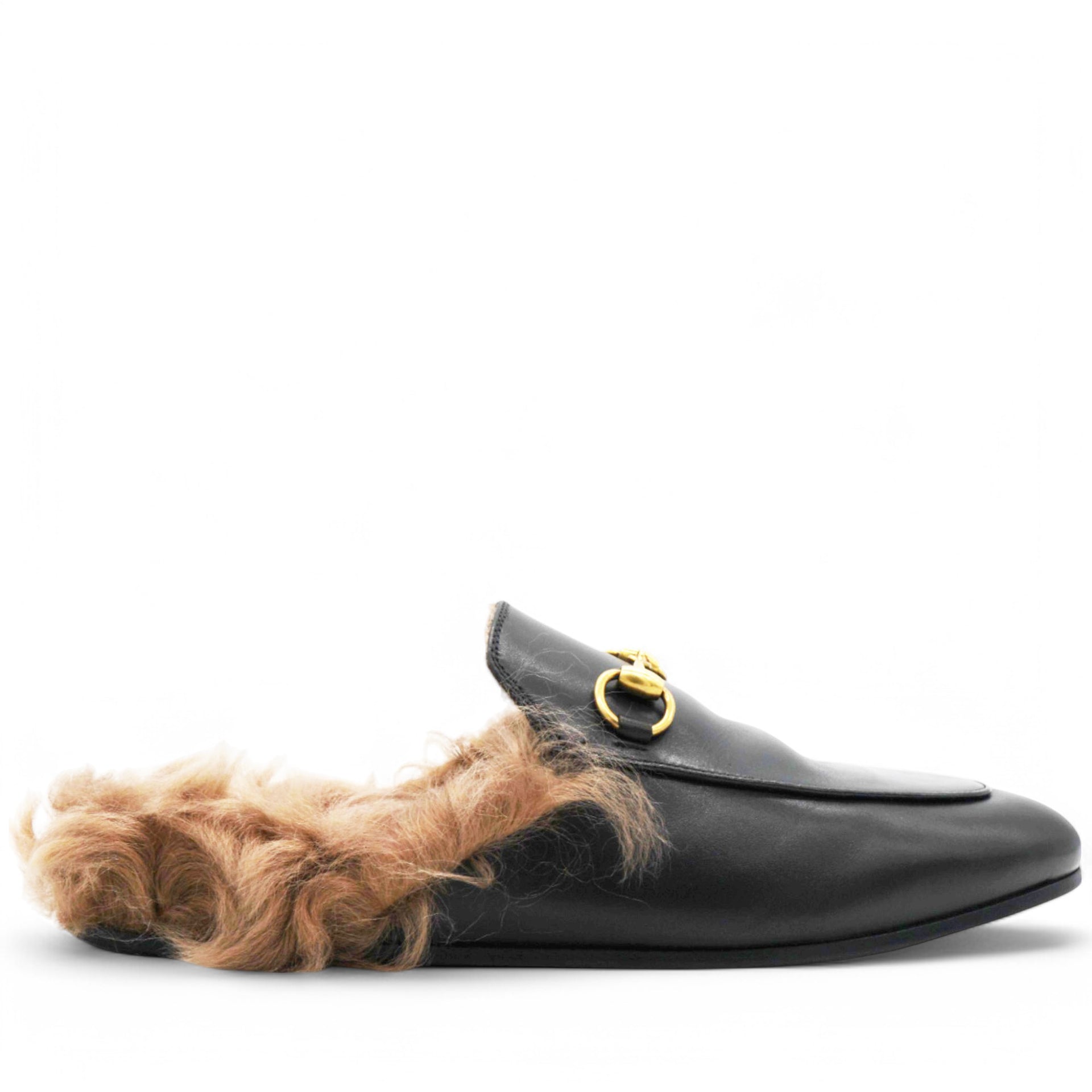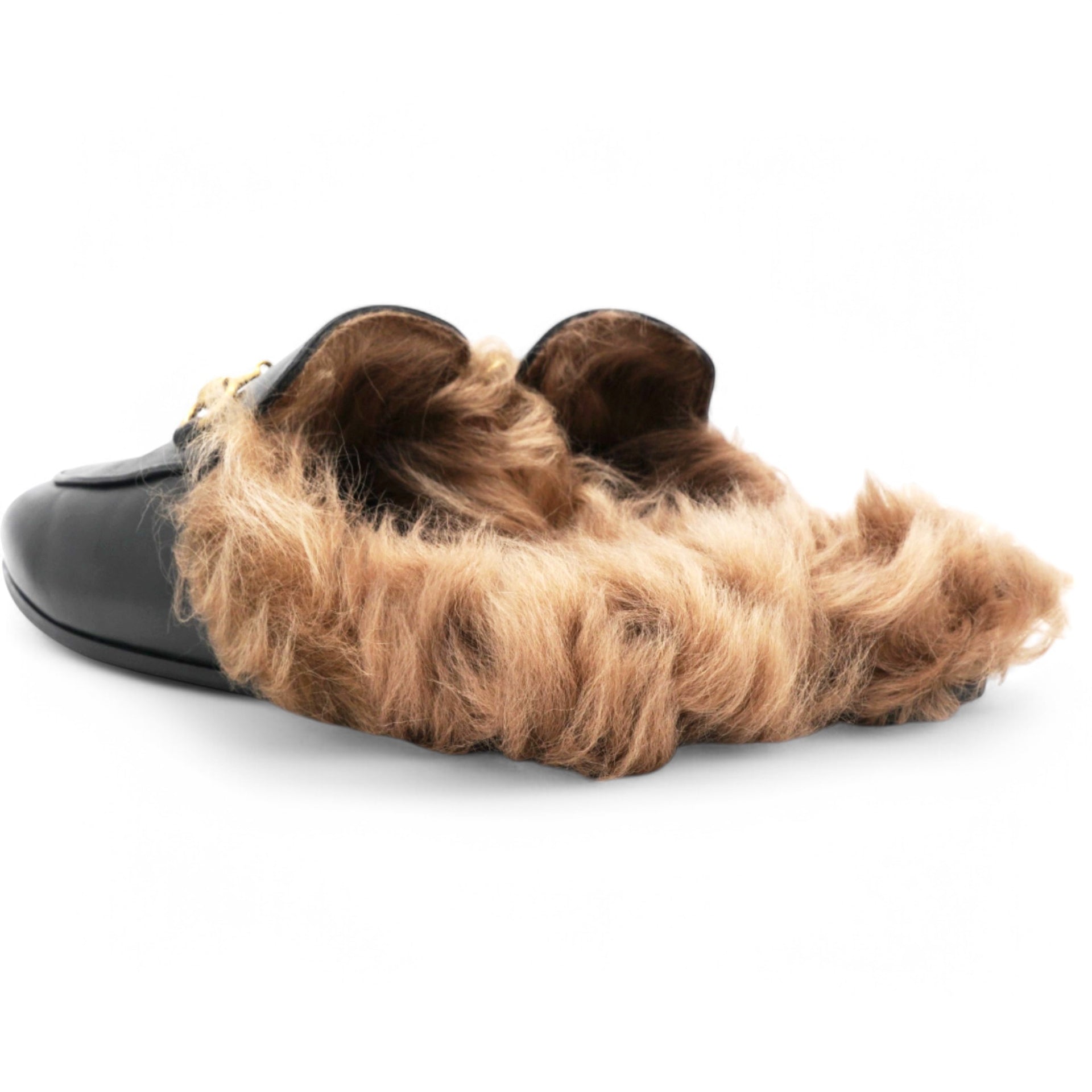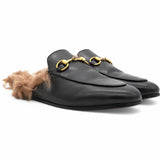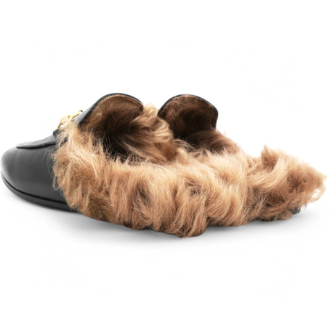 These chic mules are crafted of leather in black. They feature light brown fur trim and an aged gold horsebit detail on the front.