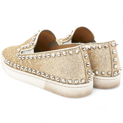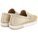 | These slip-on sneakers from Christian Louboutin are effortlessly suave and amazingly stylish! Radiating a glitter gold, they come crafted from glitter leather and feature round toes and multiple spikes adorning the edges. They are equipped with comfortable insoles and complete with the signature red-rubber soles |