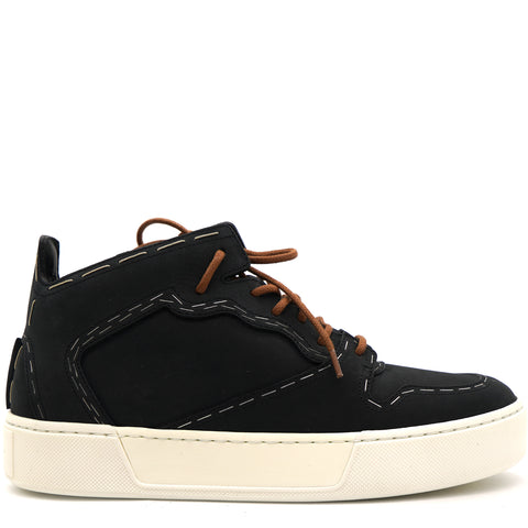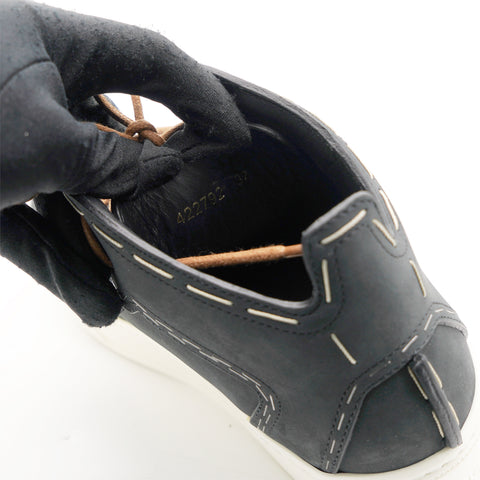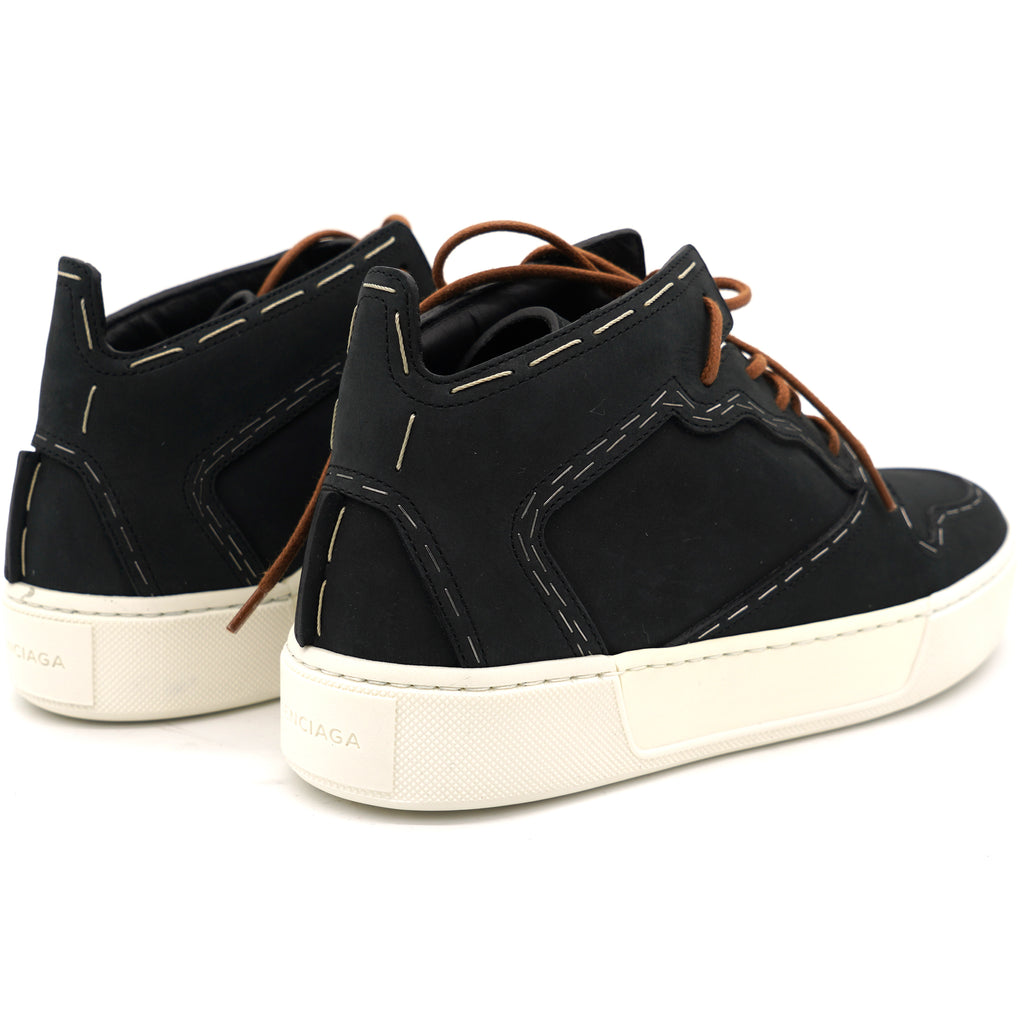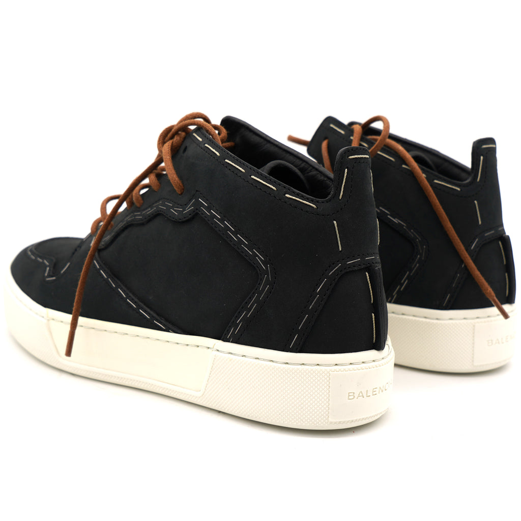 | These high-top sneakers from Balenciaga are here to provide a sense of style and comfort to your everyday ensemble. Their shape helps you choose both comfort and style. They are made with navy suede and feature tan colour lace-ups, silver staple all around the upper edges, rounded toes, and sturdy contrasting rubber soles. Get ready to explore the different levels of fashion trends with these sneakers. |