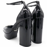 | These stunning pumps are crafted of soft leather black. These feature a 1.5-inch platform, a 4.75-inch heel, a rounded closed toe, and ankle straps that can adjust with a silver clasp. |