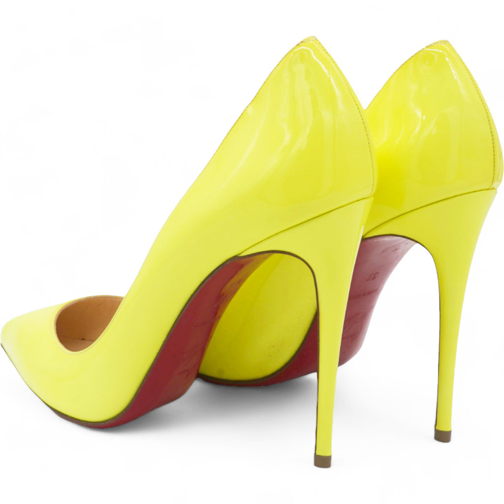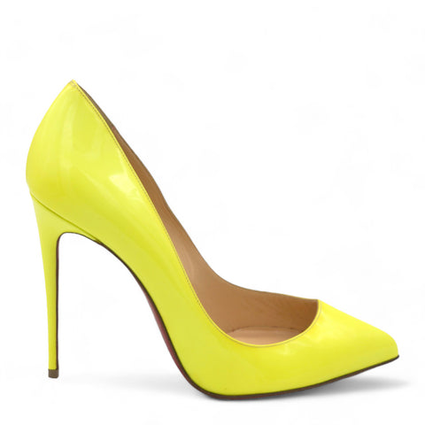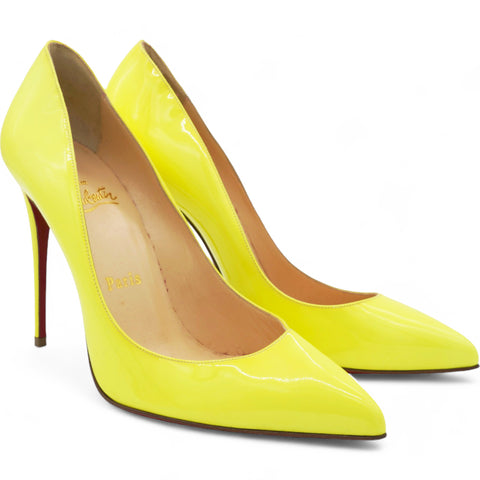 | These classic single sole pumps are made of glossy neon yellow patent leather with an extreme point at the toe and a 4.5 inch stiletto heel, finished with iconic red lacquered soles. |