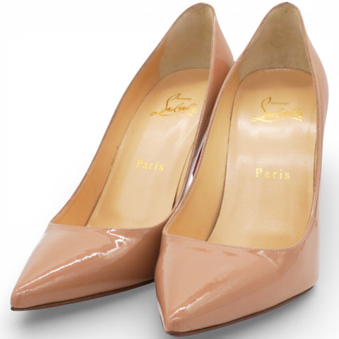 | These are authentic CHRISTIAN LOUBOUTIN Patent Pigalle 120 Pumps size 38 in Nude. These chic pumps are crafted of patent leather in beige. |