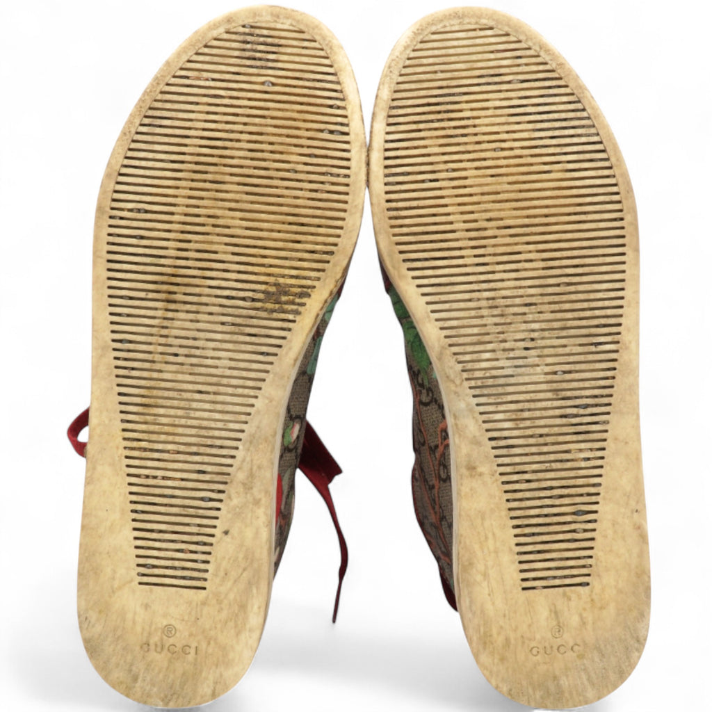| Created to provide comfort and designed to fetch admirers, this pair of high-top sneakers by Gucci is absolutely a worthy buy. The sneakers have been crafted from GG canvas and designed with round toes, suede trims, and lace-ups on the vamps. They flaunt Gucci's blooms print on them while comfortable leather-lined insoles and tough rubber soles make them ideal for everyday wear. |