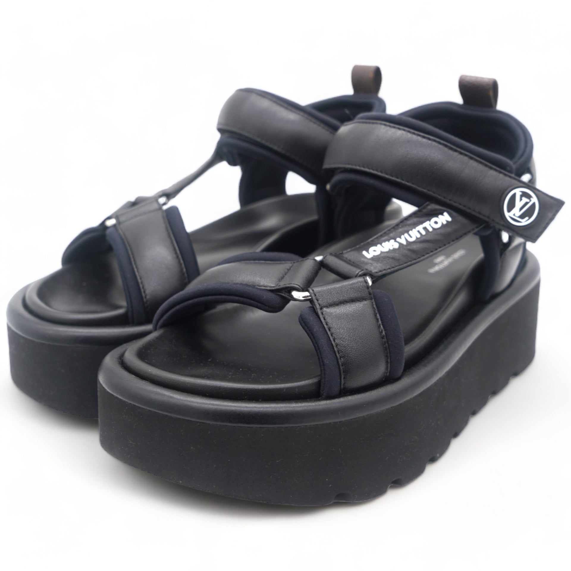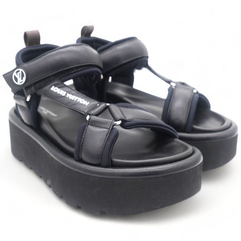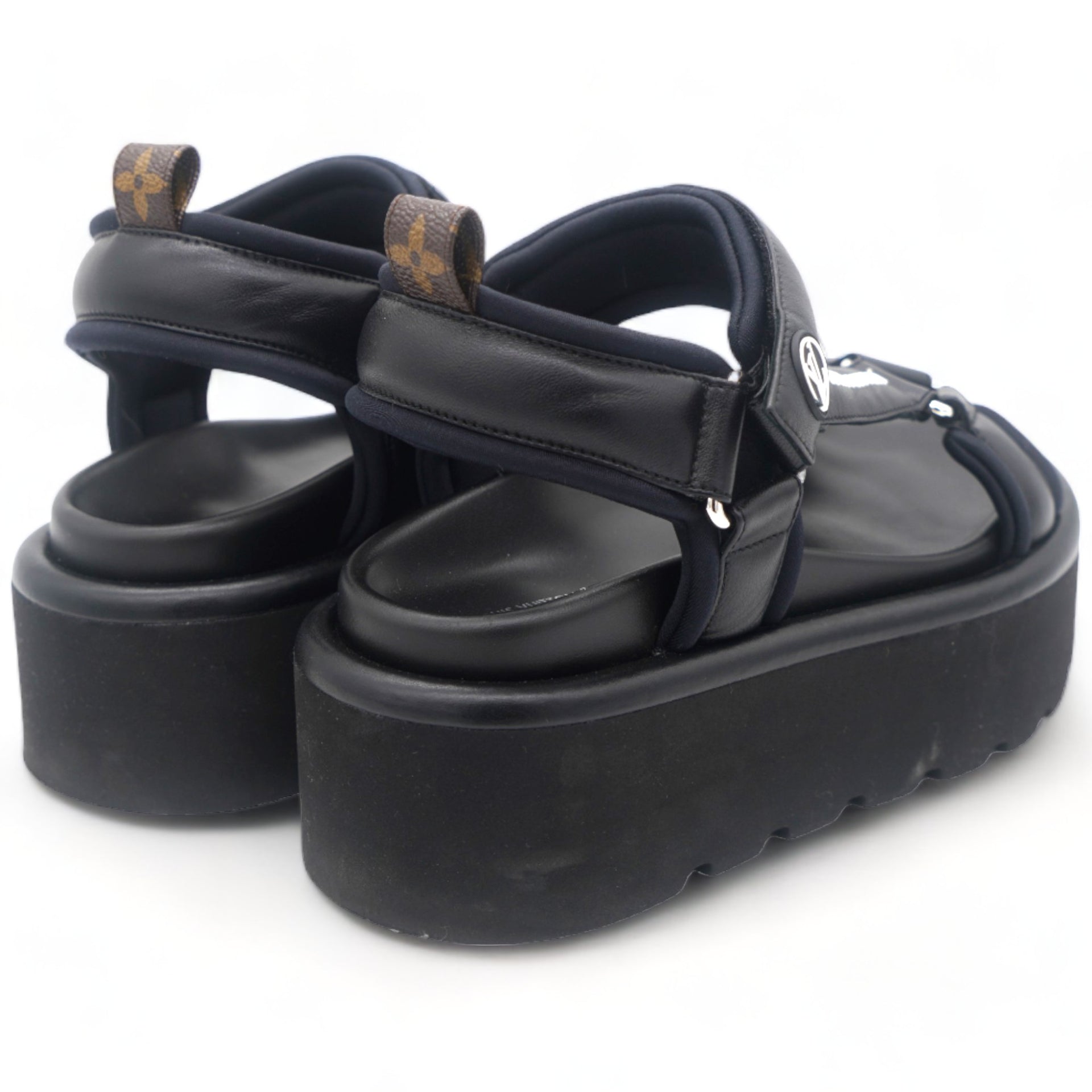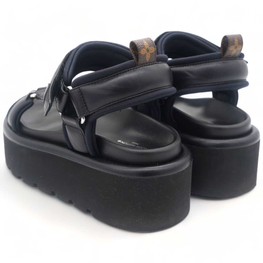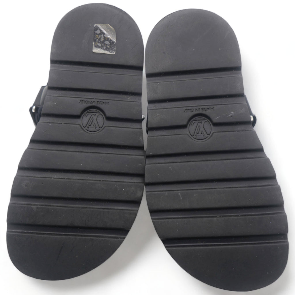 | These chic mules are crafted of black leather and monogram toile canvas. They feature a mid strap and an adjustable toe strap with a polished silver buckle. These are perfectly chic mules, from Louis Vuitton! |
