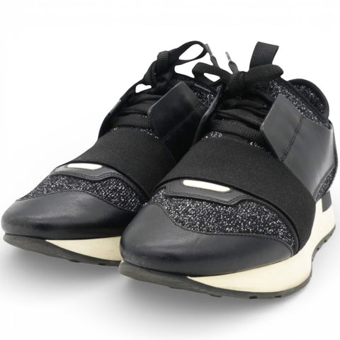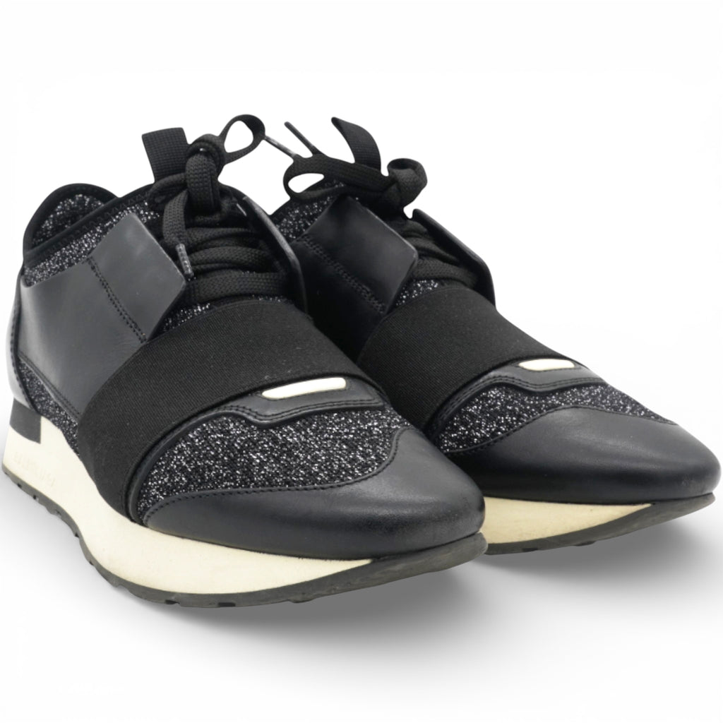 | Balenciaga Race Runners sneakers in black, featuring glitter detailing for a bold statement. Designed with elasticated straps for a secure fit and finished with a durable rubber sole for everyday comfort. |