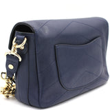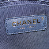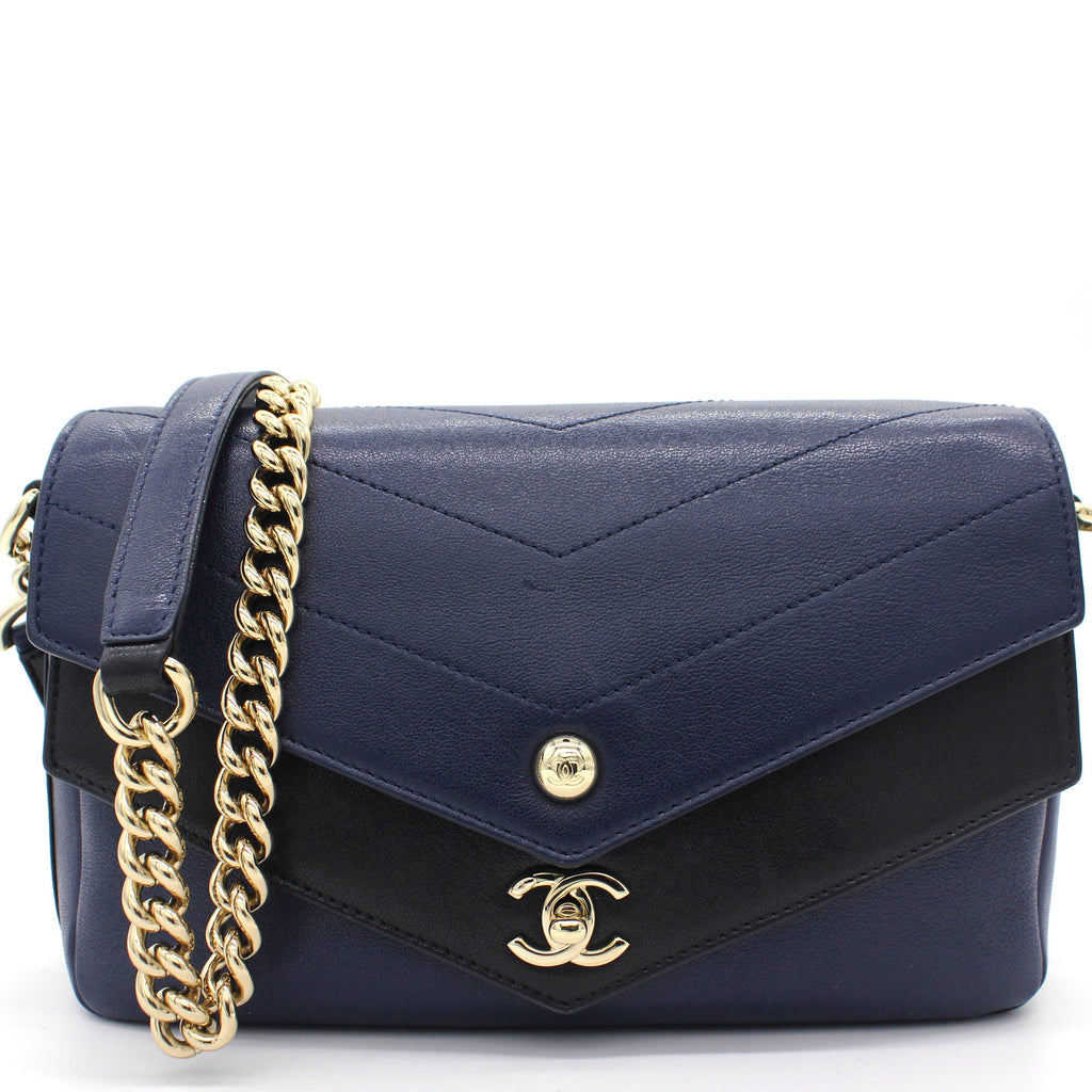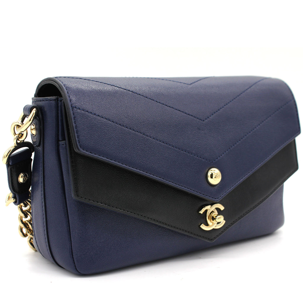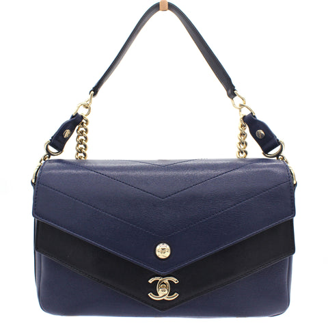 | This chic shoulder bag is crafted of black and navy Calfskin chevron-stitched leather. This handbag features a chain-link top handle, a chain shoulder strap with a leather pad and a Chanel CC logo and a front pocket on the front. The zipper opens to a navy fabric interior with a zipped pocket and enough room for day or evening necessities |