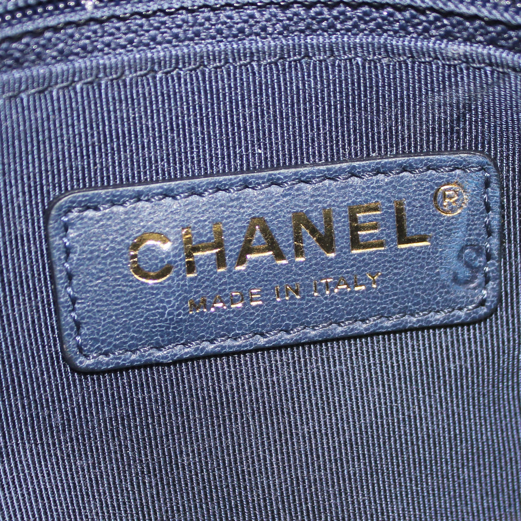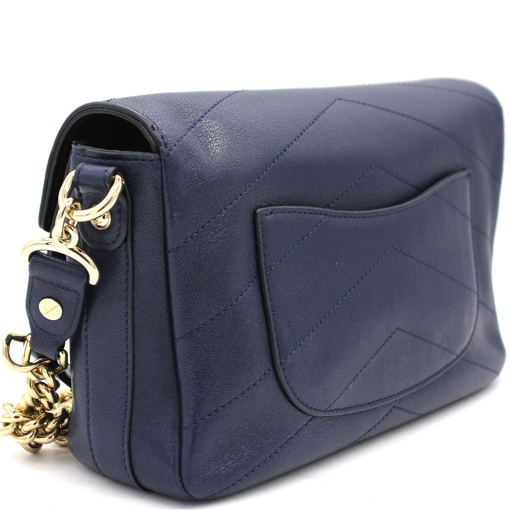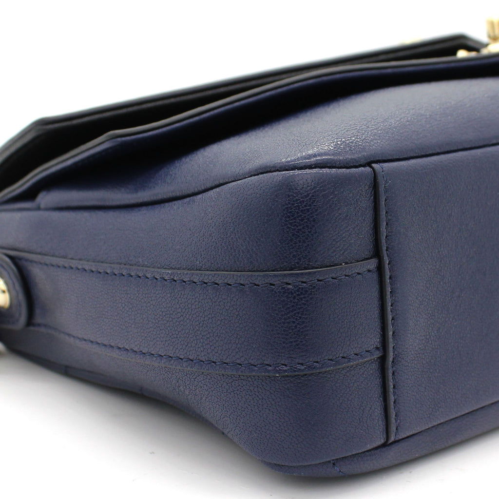 Exterior Material: Black and navy calfskin exterior with a chain-link top handle, a chain shoulder strap and a front patch pocket. Interior Material: Navy fabric lining with one main compartment and a zipped pocket.. Accessories: Dust Bag Serial Number: 26182969 Bought Year: 2018 |