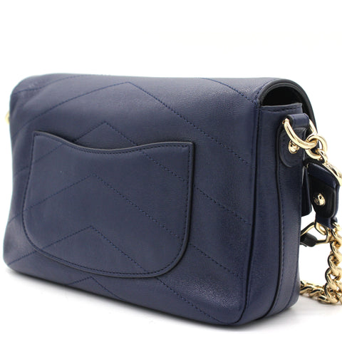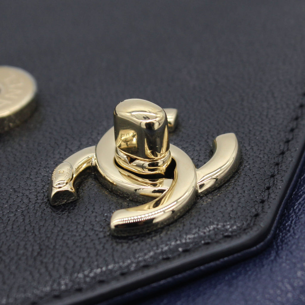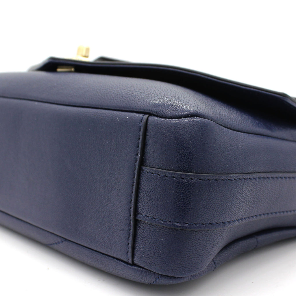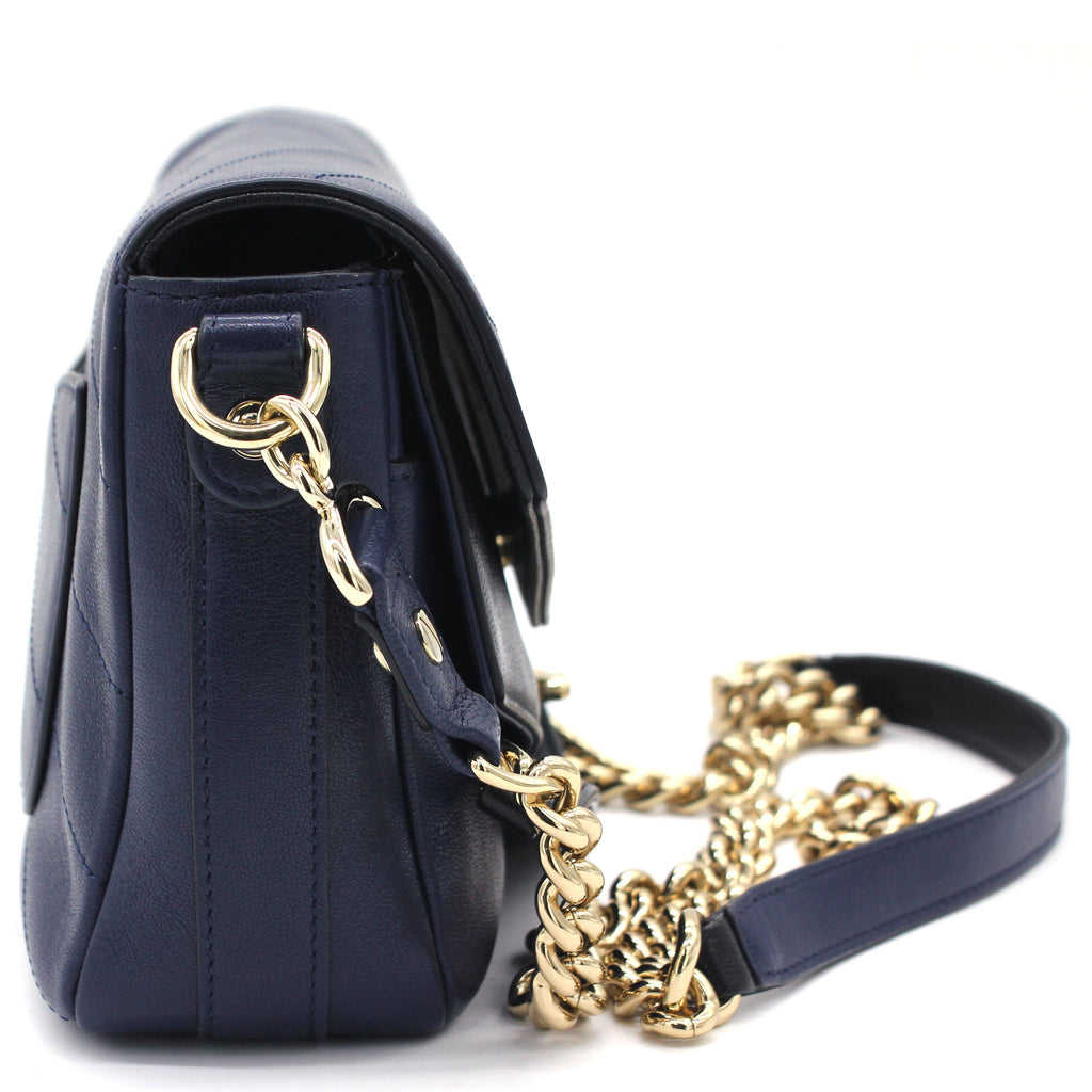 Exterior Material: Black and navy calfskin exterior with a chain-link top handle, a chain shoulder strap and a front patch pocket. Interior Material: Navy fabric lining with one main compartment and a zipped pocket.. Accessories: Dust Bag Serial Number: 26182969 Bought Year: 2018 |