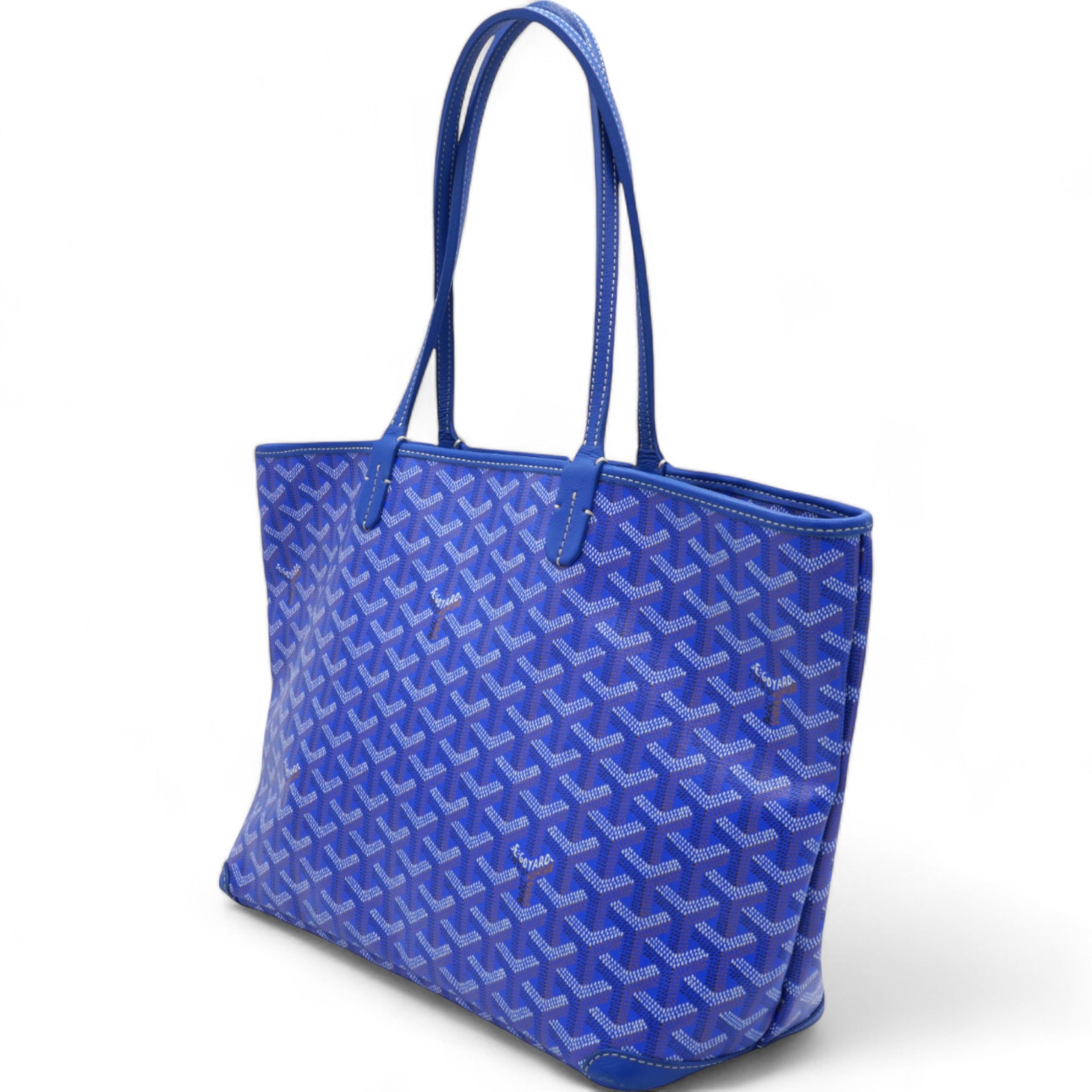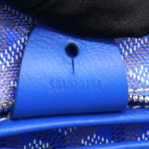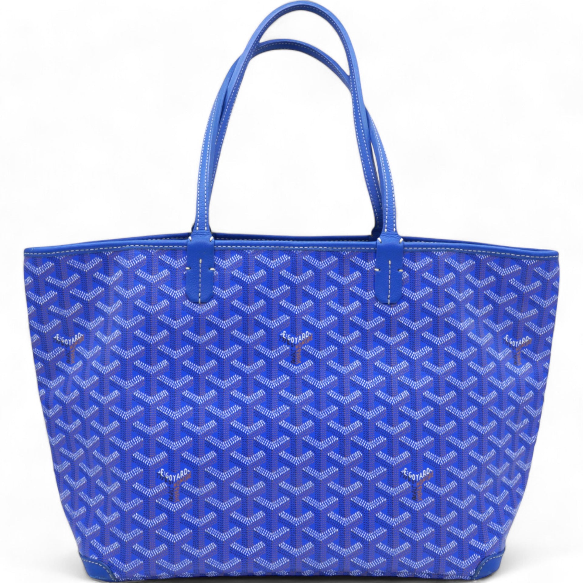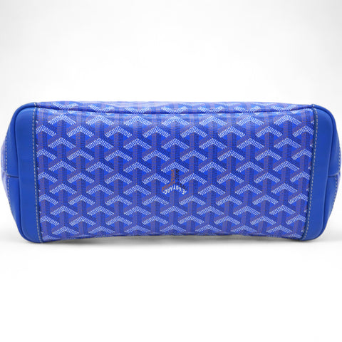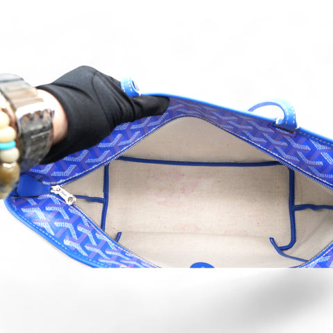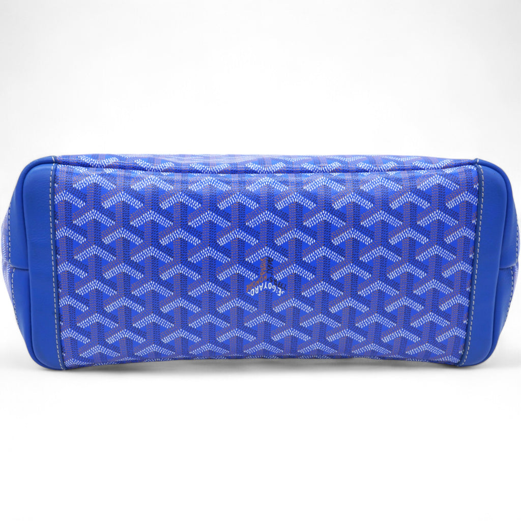 | This tote is crafted of dark blue goyardine coated canvas with the iconic chevron pattern. This tote features blue leather trim and strap handles, and a polished silver zipper that opens to a spacious natural fabric interior with a hanging patch pocket. |