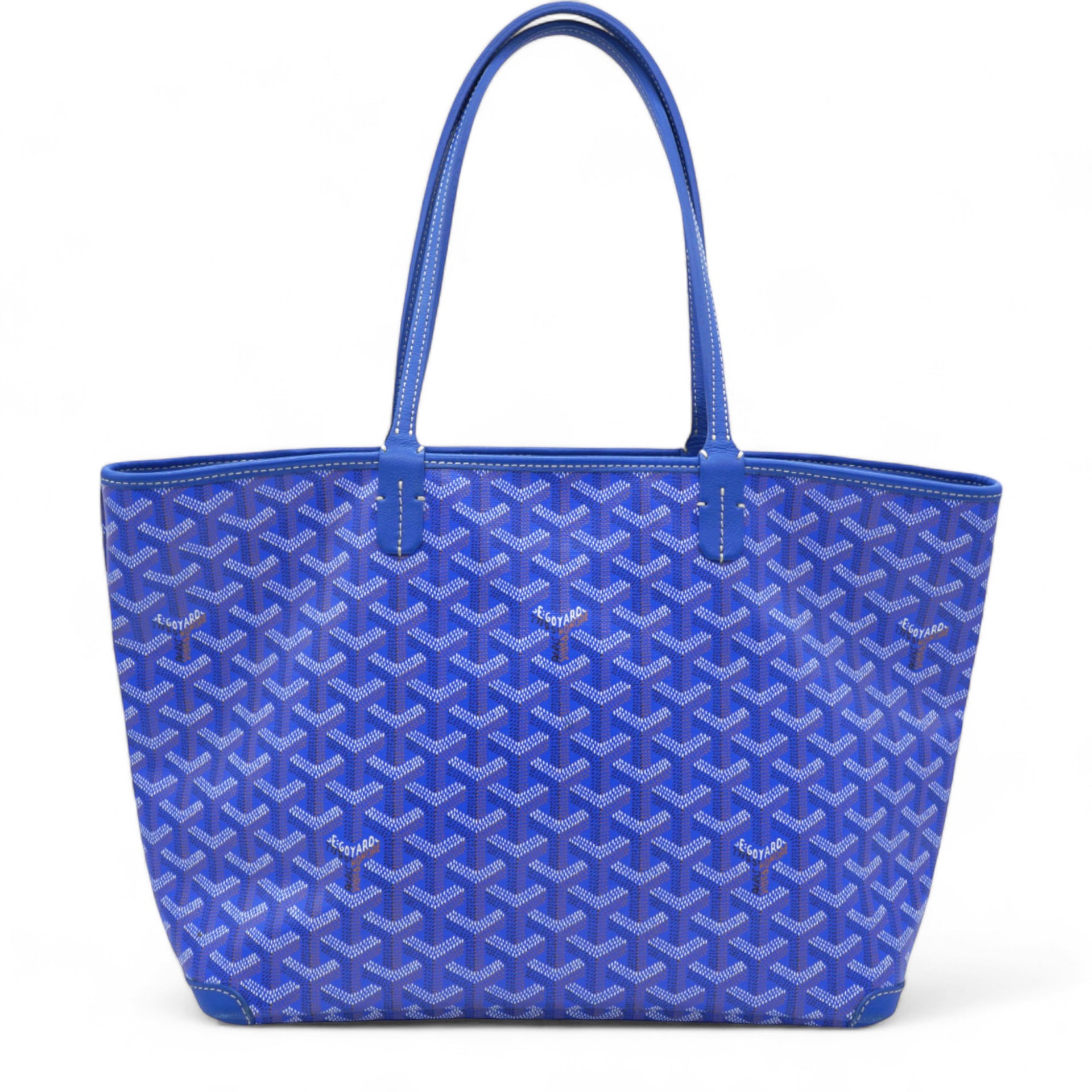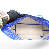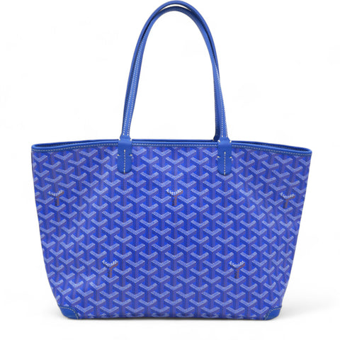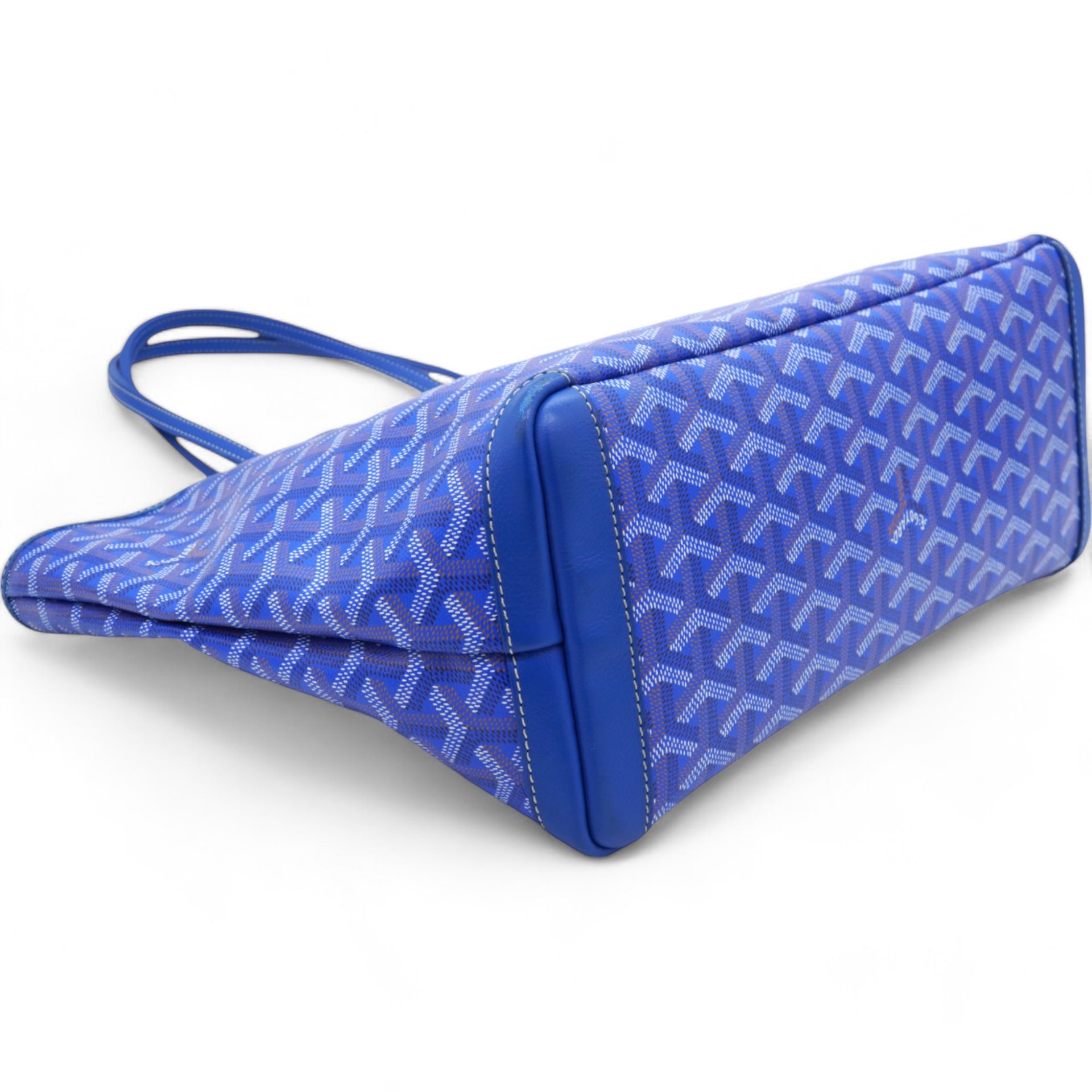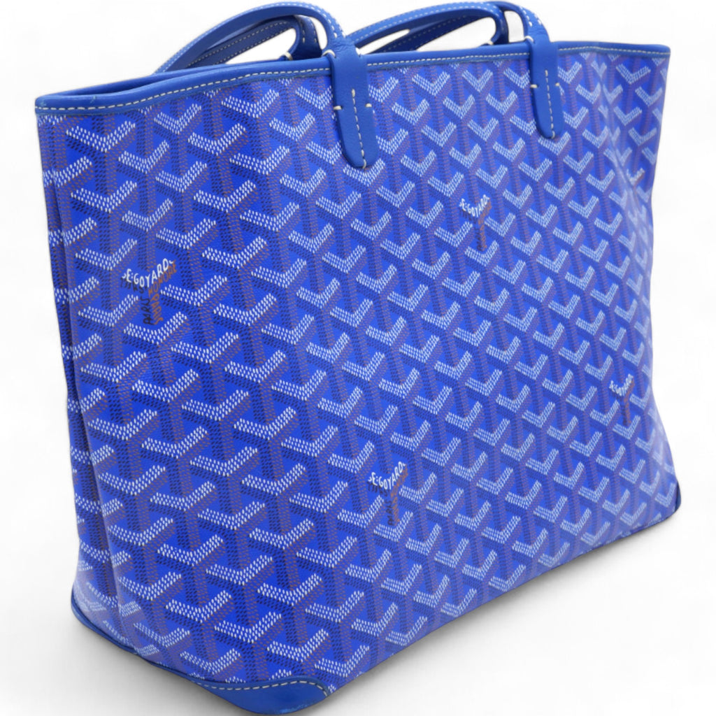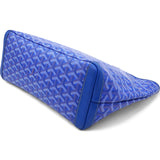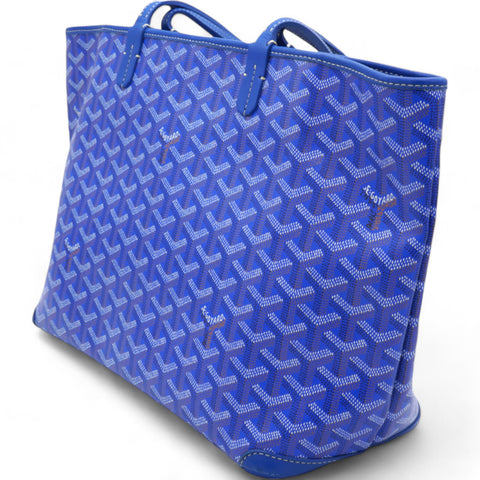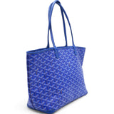 | This tote is crafted of dark blue goyardine coated canvas with the iconic chevron pattern. This tote features blue leather trim and strap handles, and a polished silver zipper that opens to a spacious natural fabric interior with a hanging patch pocket. |