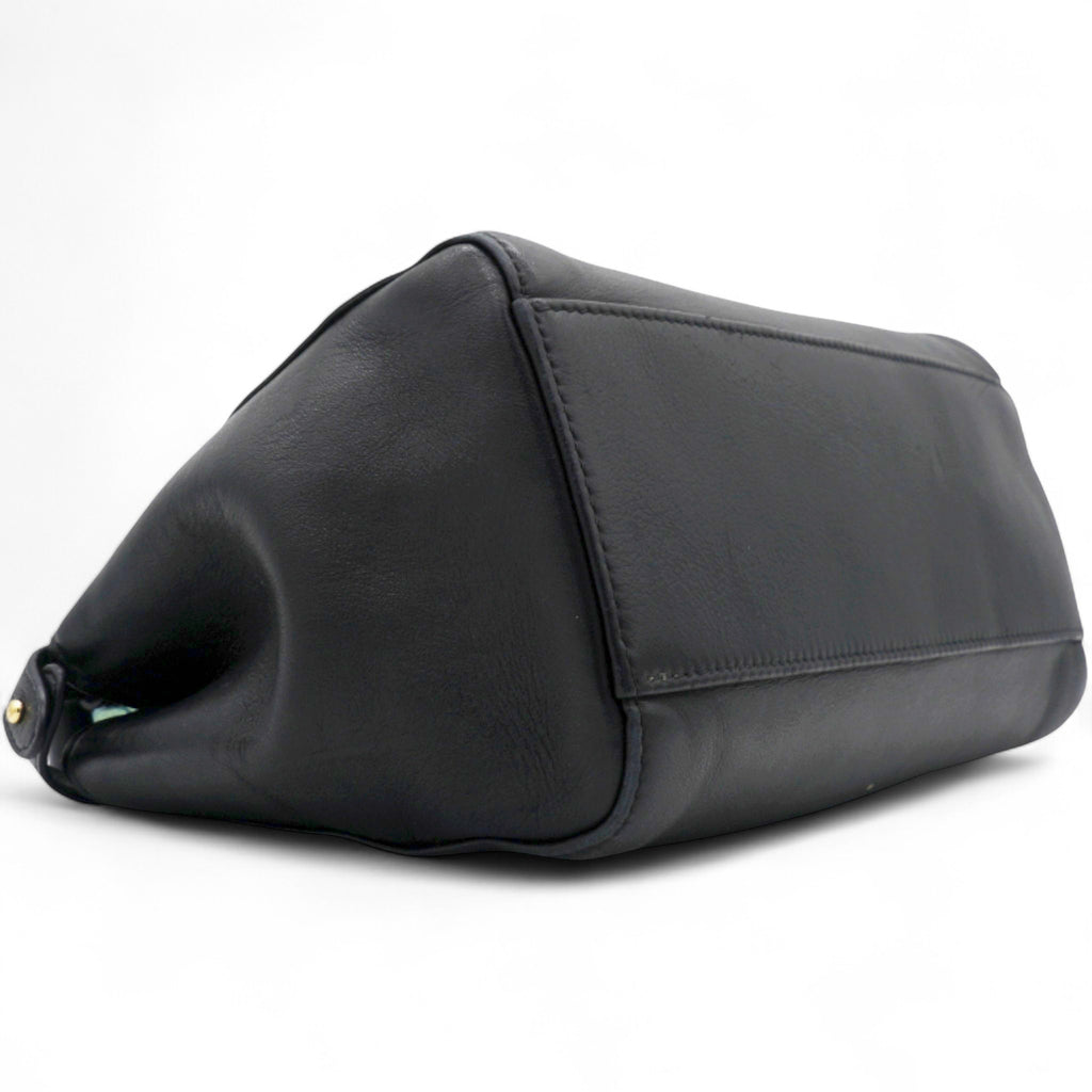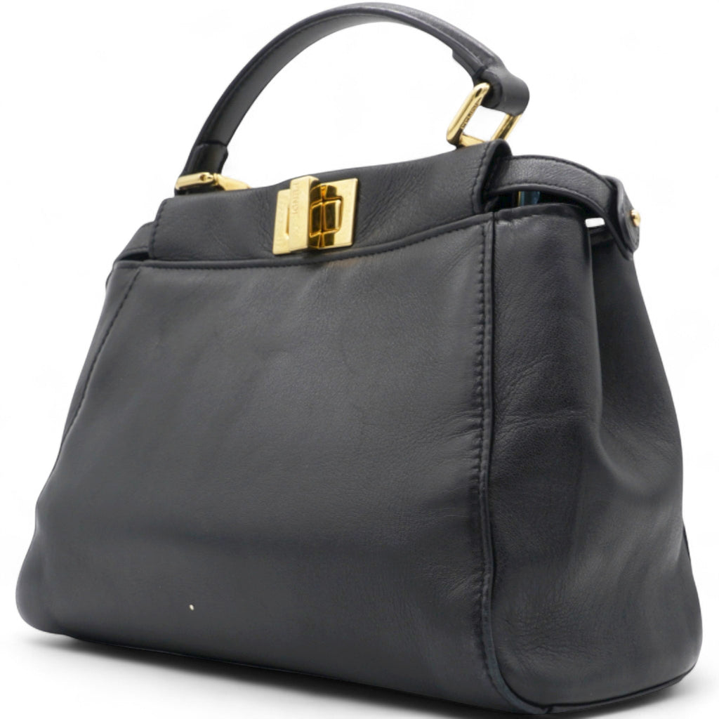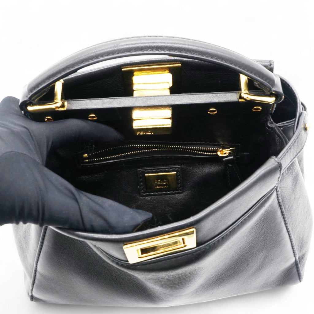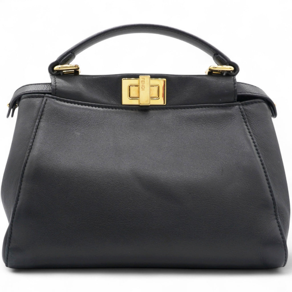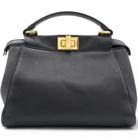 | This stylish handbag is crafted of soft nappa lambskin leather in black. It features a leather top handle, an optional crossbody strap, and gold Fendi logo turn locks. This opens to a partitioned black leather interior with patch and zipper pockets. |