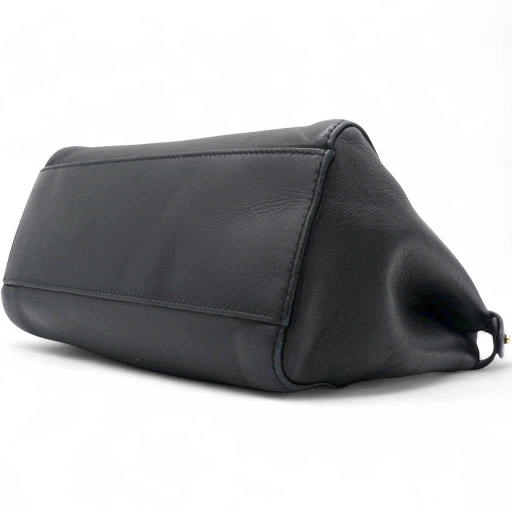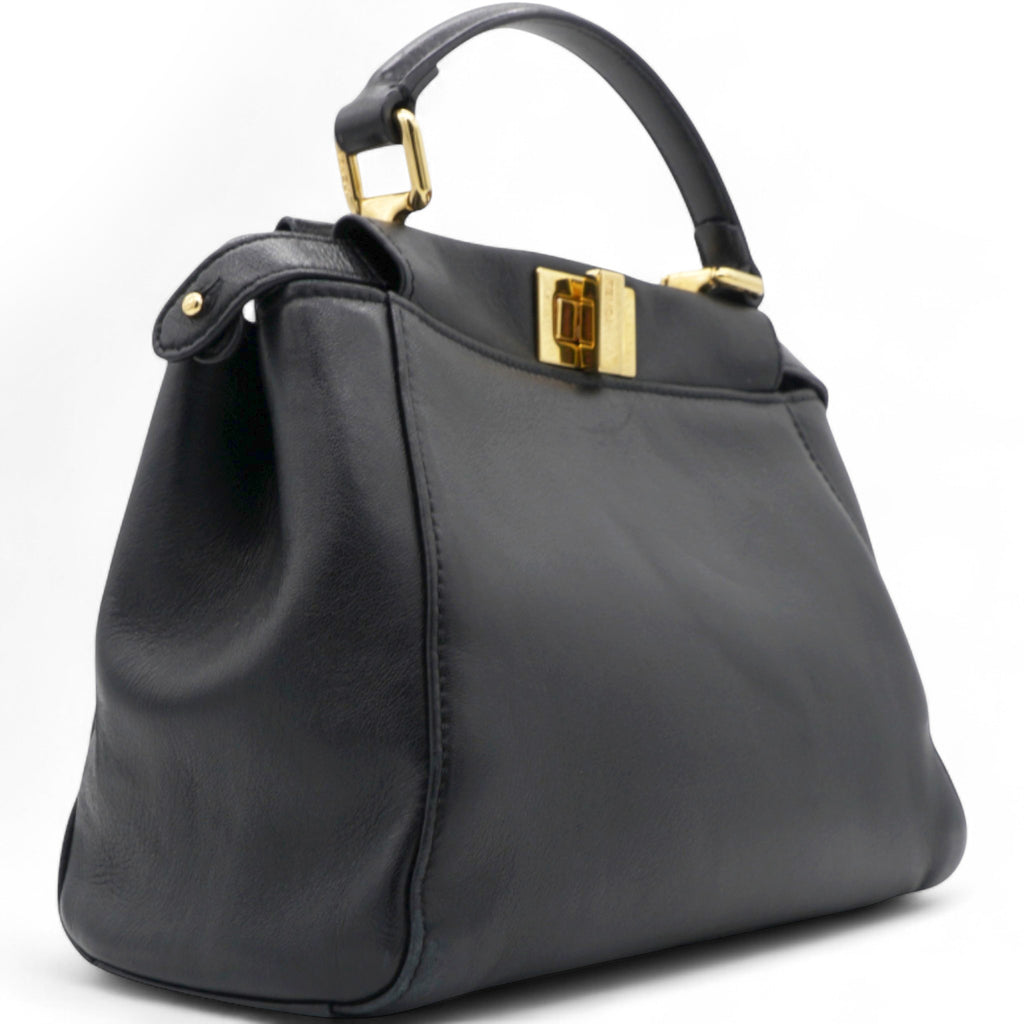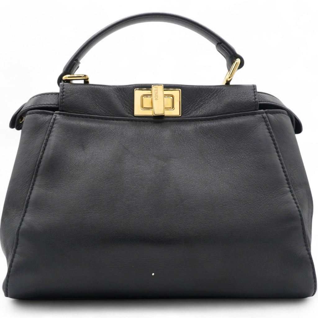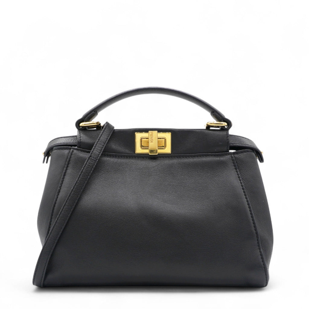 | This stylish handbag is crafted of soft nappa lambskin leather in black. It features a leather top handle, an optional crossbody strap, and gold Fendi logo turn locks. This opens to a partitioned black leather interior with patch and zipper pockets. |