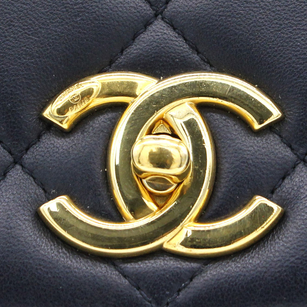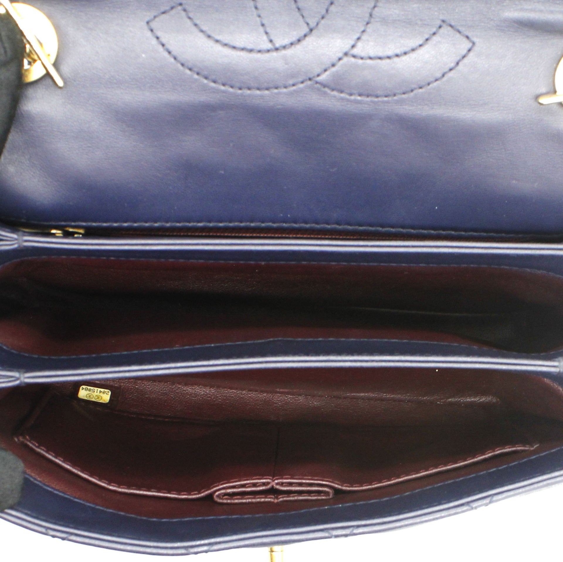 Exterior Material: Navy lambskin leather exterior with leather top handle and leather threaded shoulder strap.