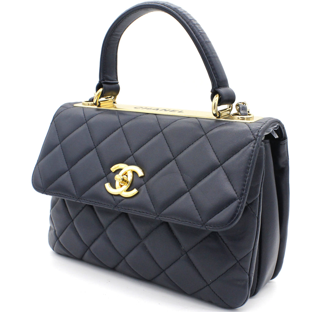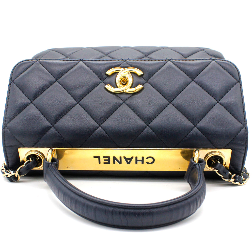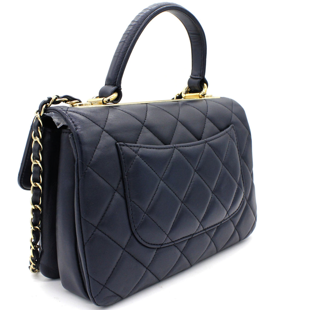 One would possibly trade any other bag for this Trendy flap shoulder bag from Chanel. The iconic CC turn lock in gold-tone hardware lies beautifully on the navy blue quilted exterior crafted from leather. The back of the bag has an easy slip pocket and the leather interior has spacious compartments to hold your essentials. With a comfortable top handle drop and the interwoven shoulder strap, you can carry it in any way you fancy.