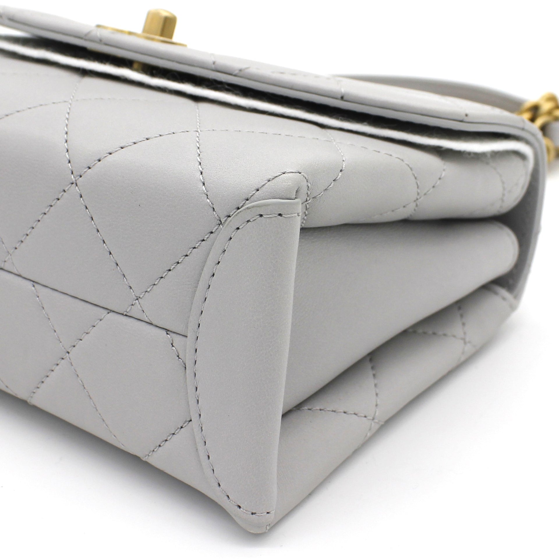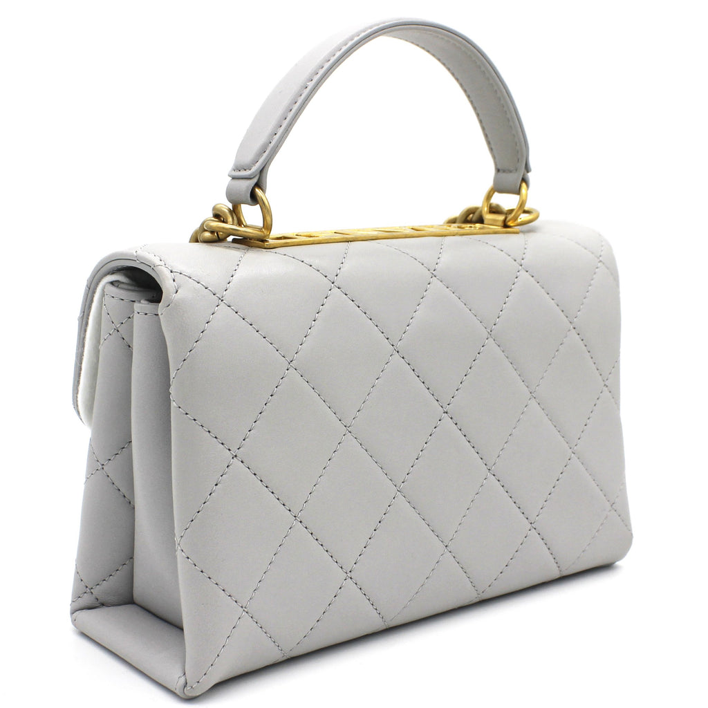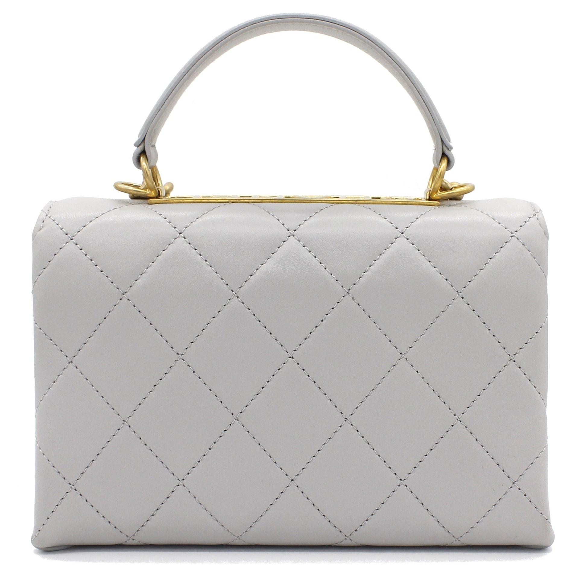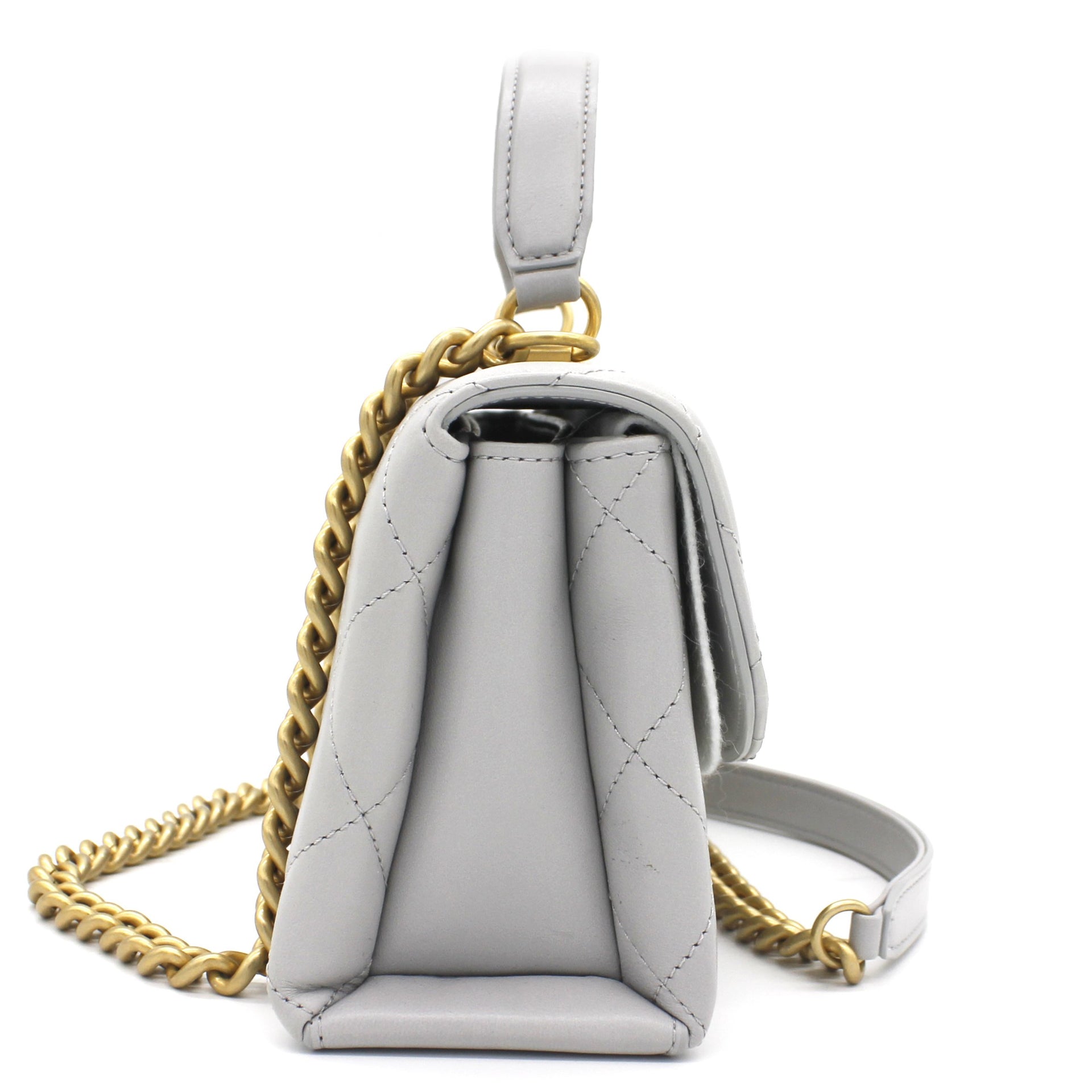 Exterior Material:   White grey quilted lambskin with top handle comes with gold-tone hardware, single flat top handle, single chain-link shoulder strap with shoulder guard, logo hardware embellishment at top.